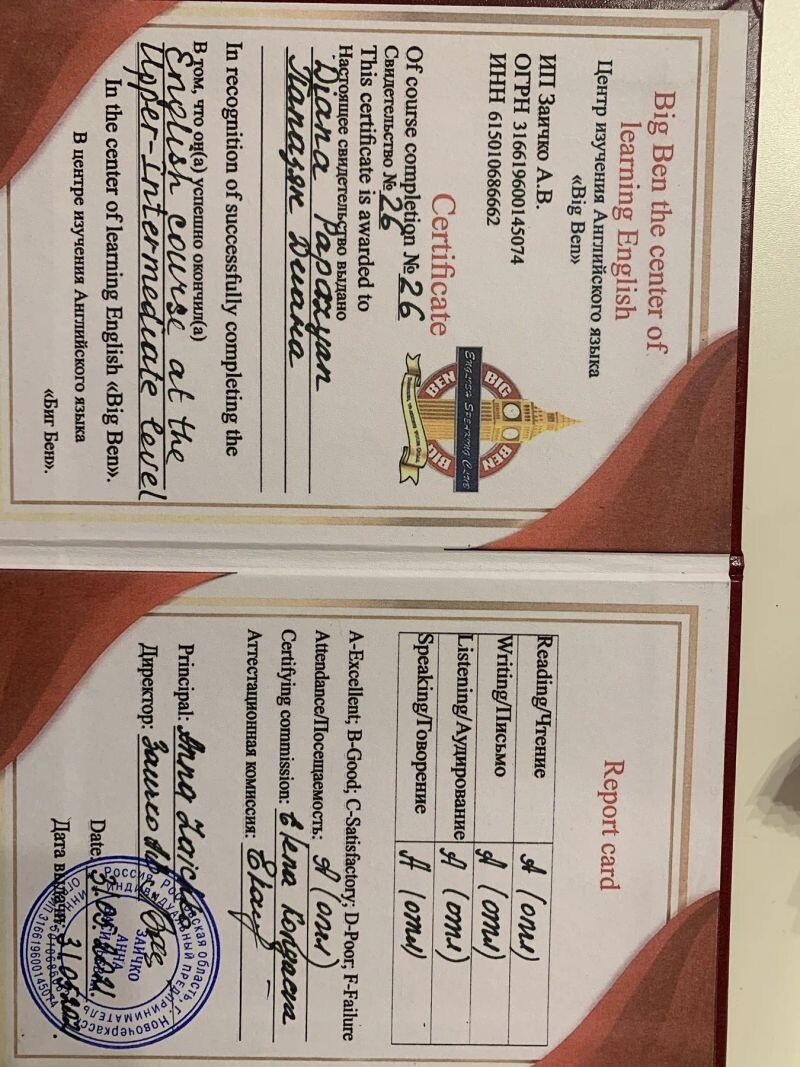 - Диплом об окончании Английской школы с знанием англиканского языка на уровне Upper-intermediate (с 2021 г.).