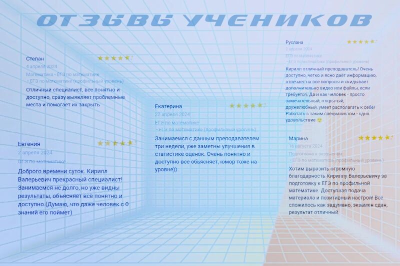 Хотим выразить огромную благодарность Кириллу Валерьевичу за подготовку к ЕГЭ по профильной математике. Доступная подача материала и позитивный настрой! Всё сложилось как задумано, экзамен сдан, результат отличный.