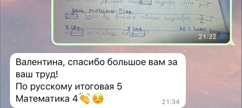 Я очень довольна результатом занятий, моя дочка стала гораздо лучше читать. было очень интересно и весело у Валентины Евгеньевны. Она действительно отличный специалист и замечательный человек. Когда я обратилась к ней в октябре 2022 года с проблемой чтения моего ребенка из второго класса, через 1,5 месяца я подключила и второго ребенка, у которого были проблемы с русским языком. И к февралю 2023 года у обоих детей есть заметные результаты, их чтение значительно улучшилось, оценки стали лучше, они стали более внимательными. Валентина Евгеньевна всегда готова помочь и ответить на вопросы, дать советы. Если у ребенка возникают трудности в школе, она акцентирует занятия на эту проблему. Мы продолжаем заниматься с ней и рекомендуем ее.
