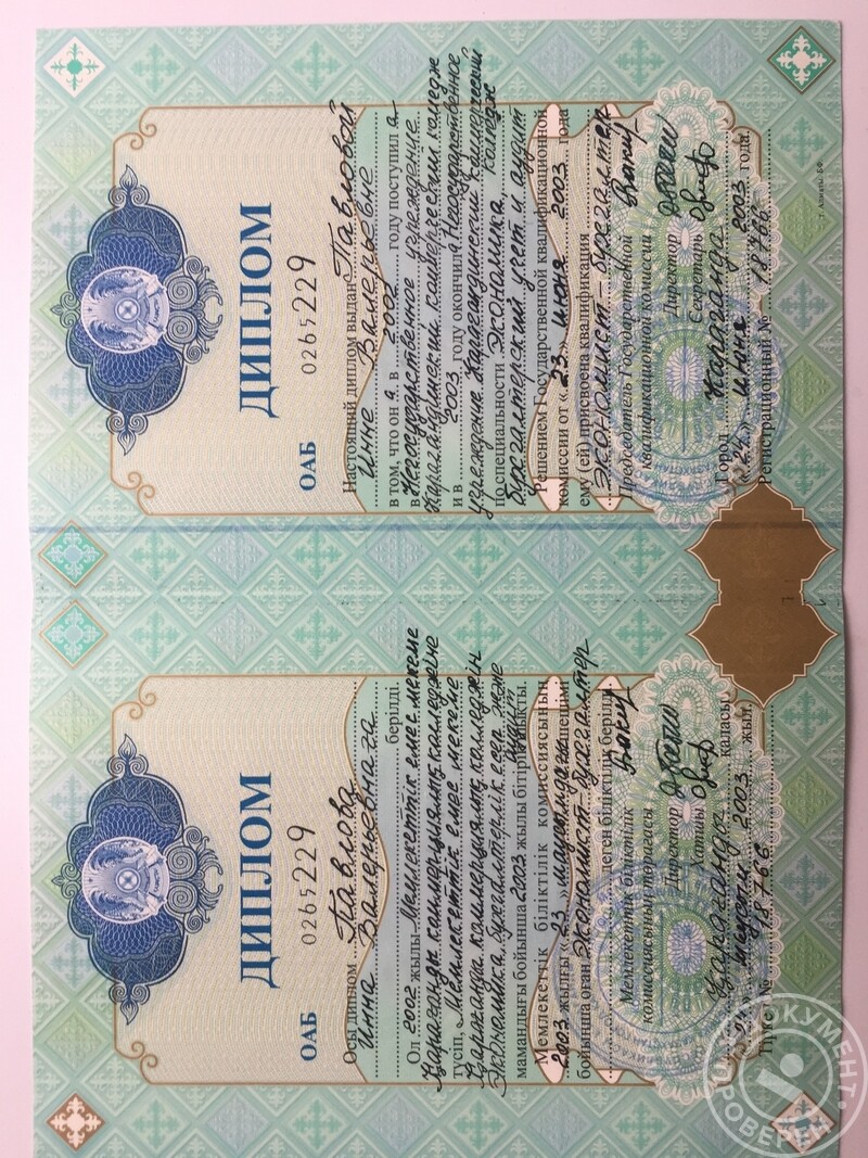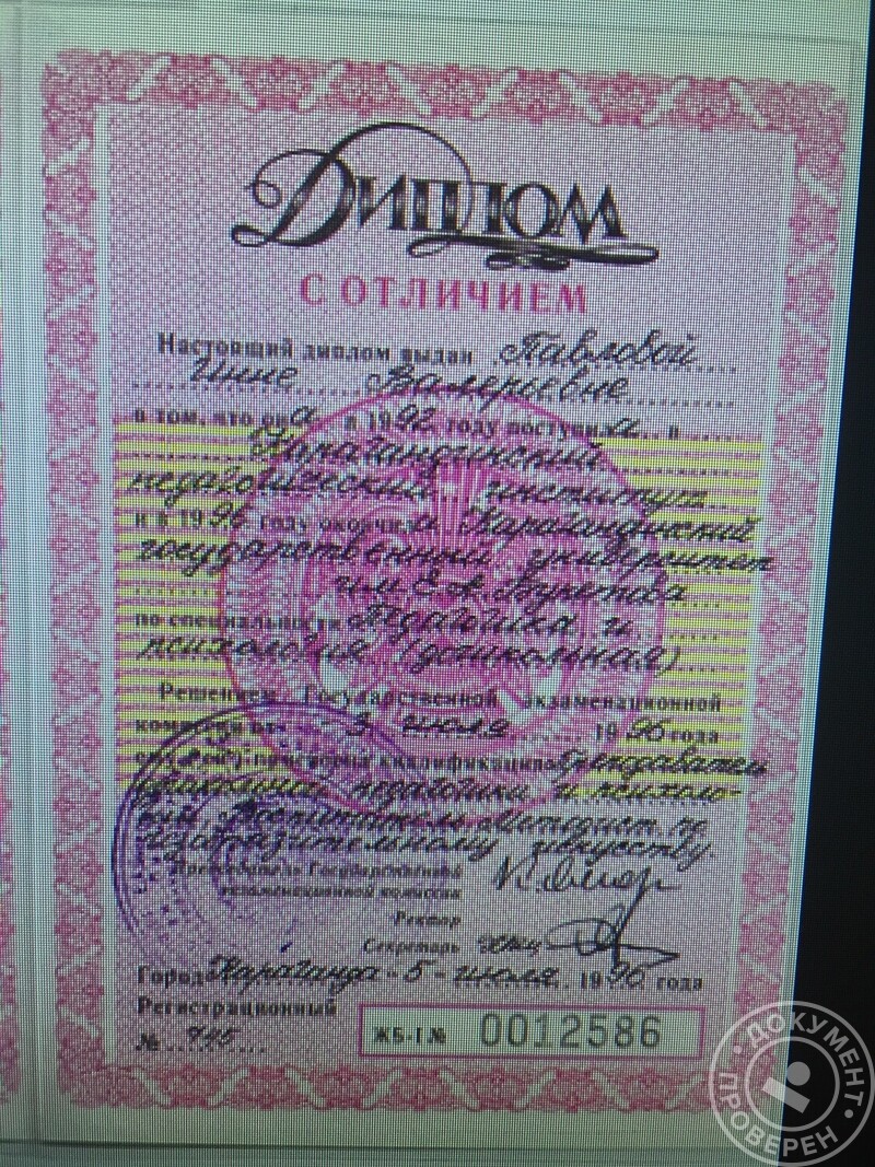 - КарГУ (Казахстан), специальность «Педагогика и психология дошкольная», квалификация – преподаватель, воспитатель, 1992–1996 гг.