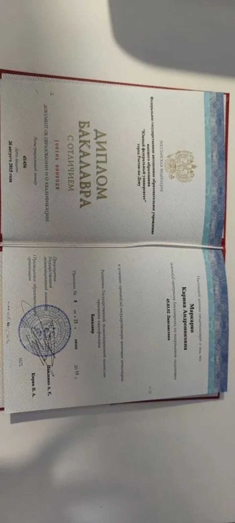 - Федеральное государственное автономное образовательное учреждение высшего руководства Южный федеральный университет, лингвистика, бакалавр, 2011–2015 гг.