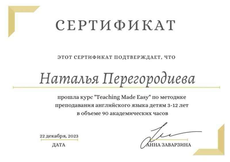 - Курс «Teaching Made Easy” по методике преподавания английского языка детям с 3-12 в объеме 90 академических часов (с 2023 г.).