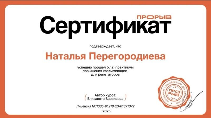 ► Связаться с Перегородиевой Натальей Александровной можно за пару минут. Нажмите на кнопку «Связаться с репетитором» и заполните короткую форму.