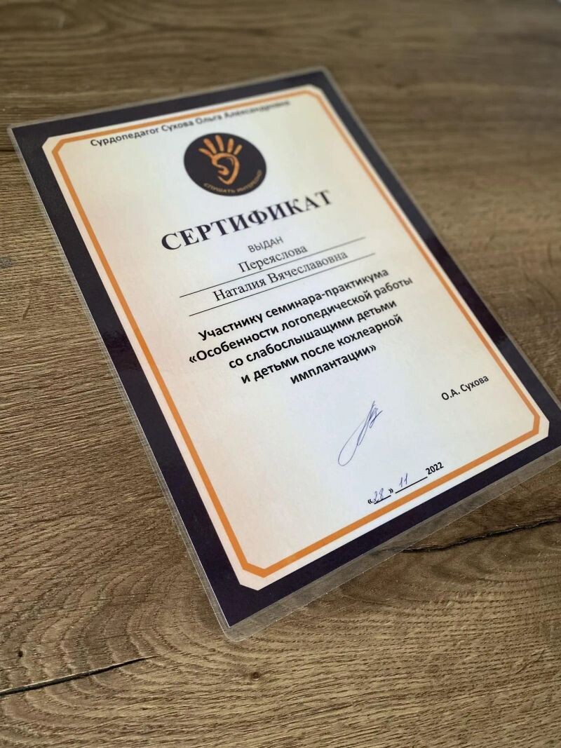 - Сурдопедагог Сухова Ольга Александровна, семинар-практикум «Особенности логопедической работы со слабослышащими детьми и детьми после кохлеарной имплантации, 2022 г.