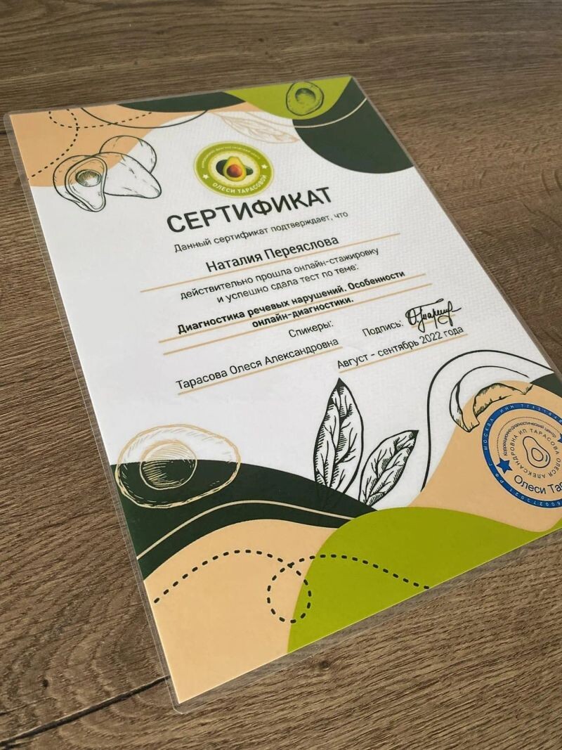 - КДЦ Олеси Тарасовой, онлайн-стажировка и тест по теме «Диагностика речевых нарушений. Особенности онлайн-диагностики», 2022 г.
