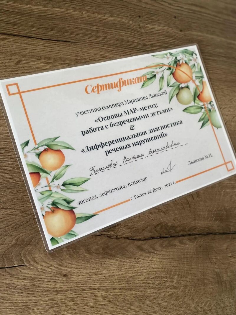 - Семинар Марианны Лынской «Основы МАР-метод: работа с безречевыми детьми», «Дифференцированная диагностика речевых нарушений», 2022 г.
