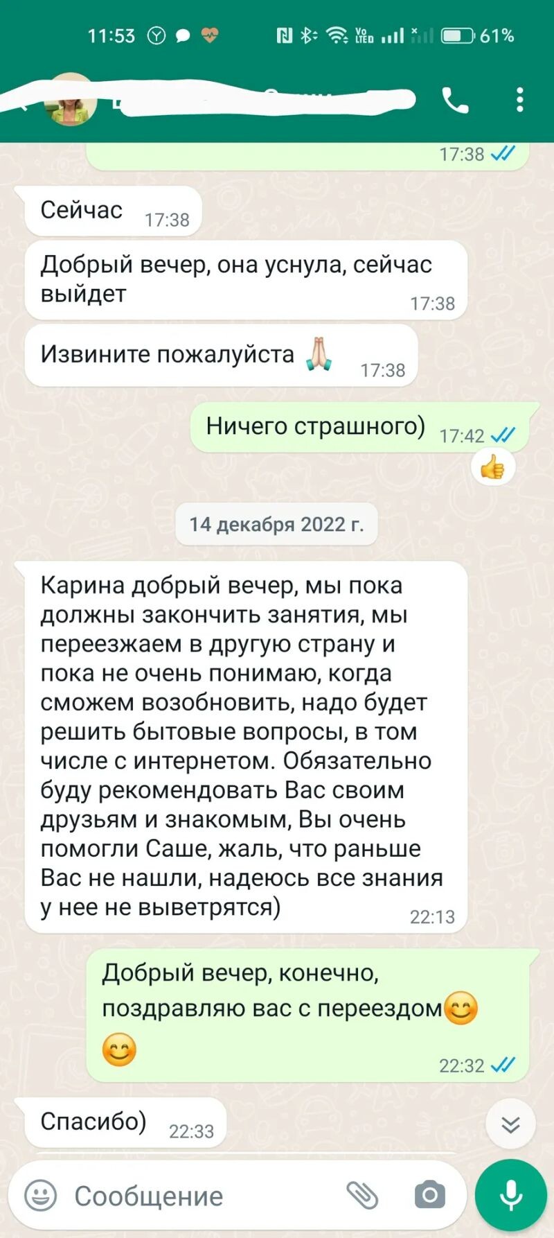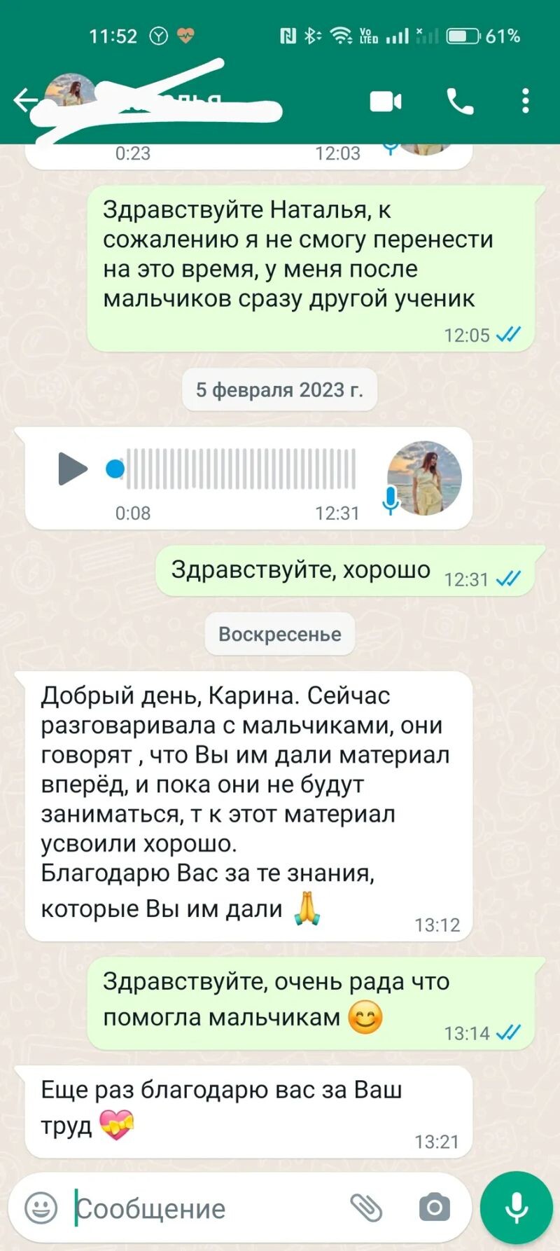 Карина очень вовремя пришла на помощь моему сыну, научила понимать и решать задачи. В новом учебном году обязательно продолжим занятия.