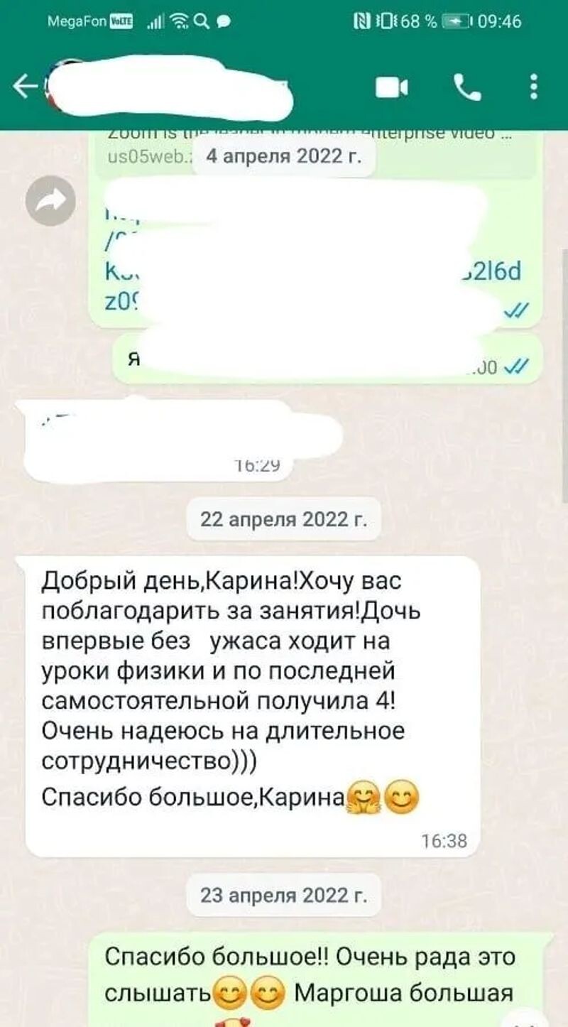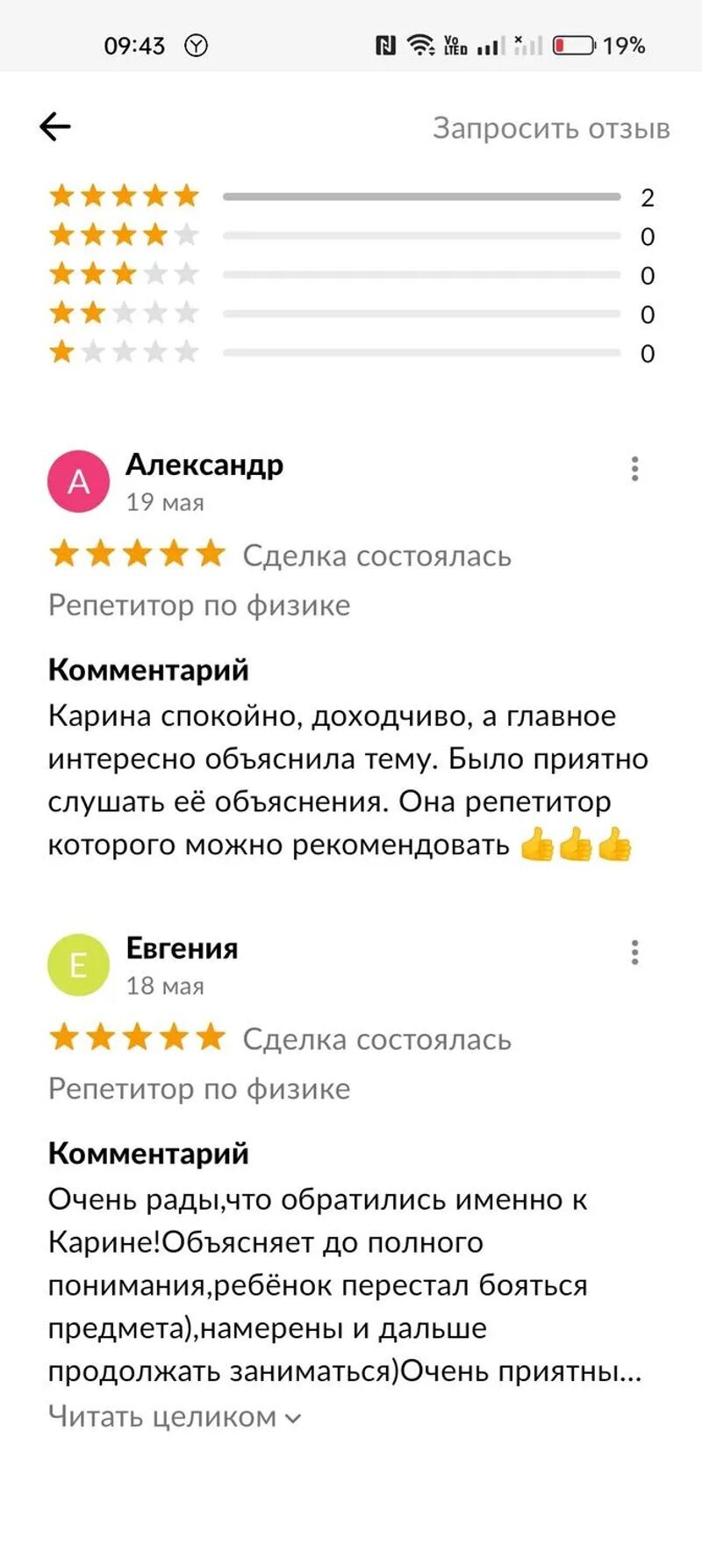Сын 13 лет занимался с Кариной Константиновной. Занятия проходили в дружеской обстановке. Карина смогла заинтересовать ребенка физикой!!! Объясняла интересно, не так как в школе. Научила понимать задачи, уметь их решать, применять нужные формулы. Доп. задания на отработку делал с радостью. Карина помогла подготовиться к устному зачету, который был успешно сдан. Будем продолжать заниматься физикой с ней и дальше.