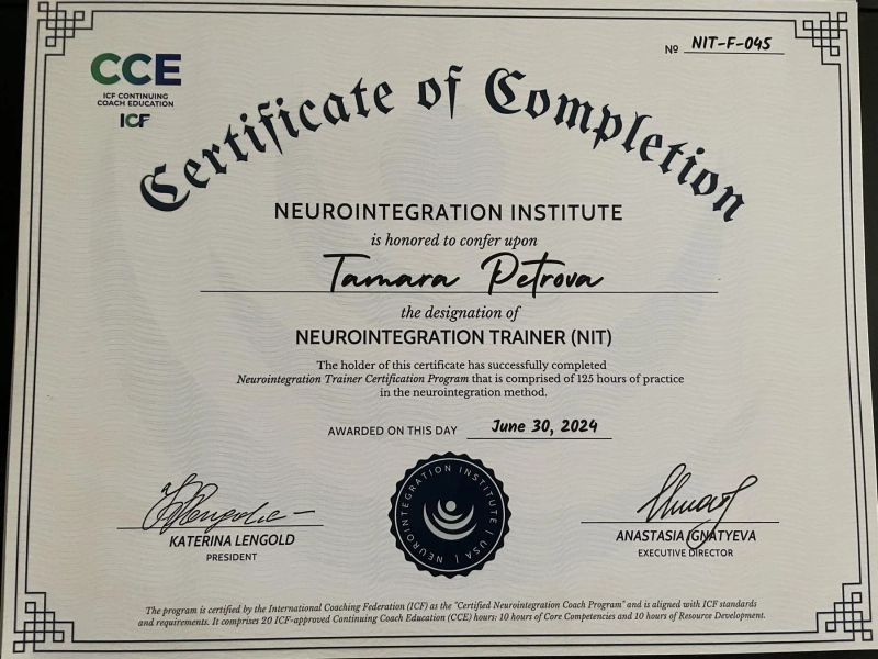 - Институт нейроинтеграции, Neurointegration Trainer (NIT), 2023–2024 гг.