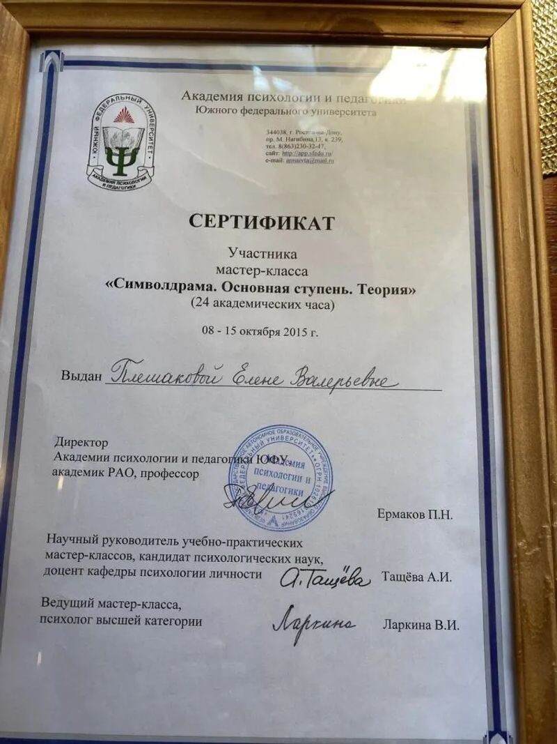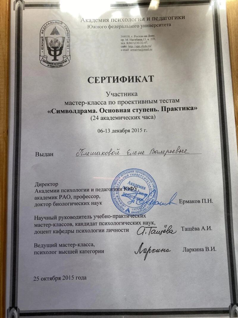 - Академия психологии и педагогики ЮФУ, мастер-класс «Символдрама. Основная ступень. Практика», 2015 г.