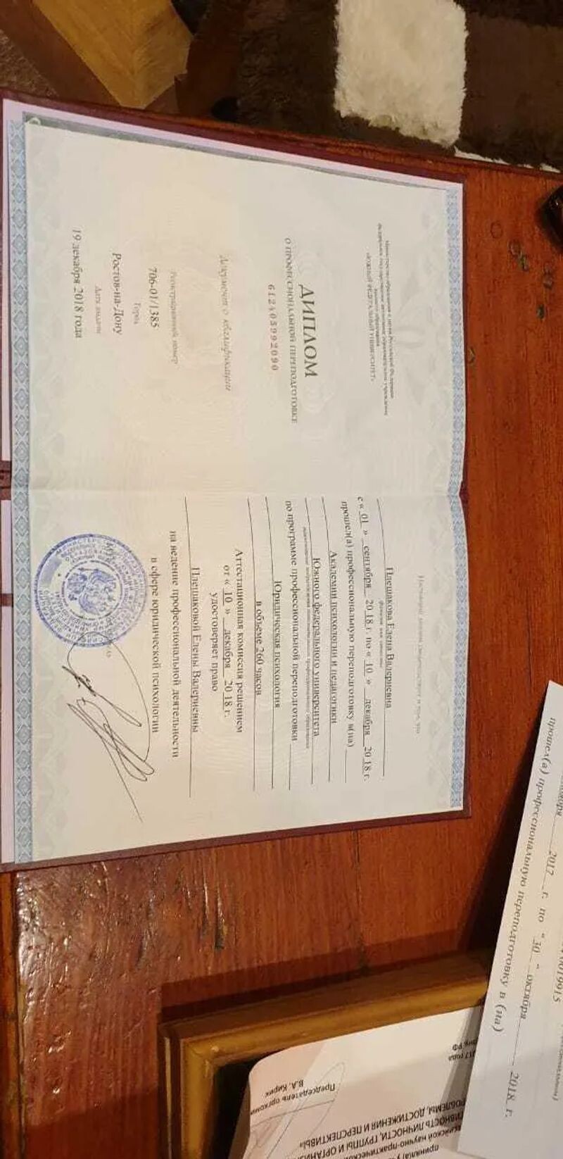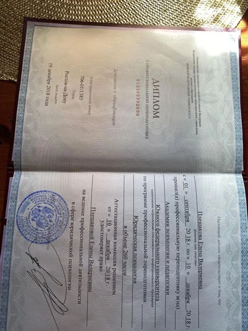- Южный федеральный университет, переподготовка, юридическая психология, 2018–2019 гг.