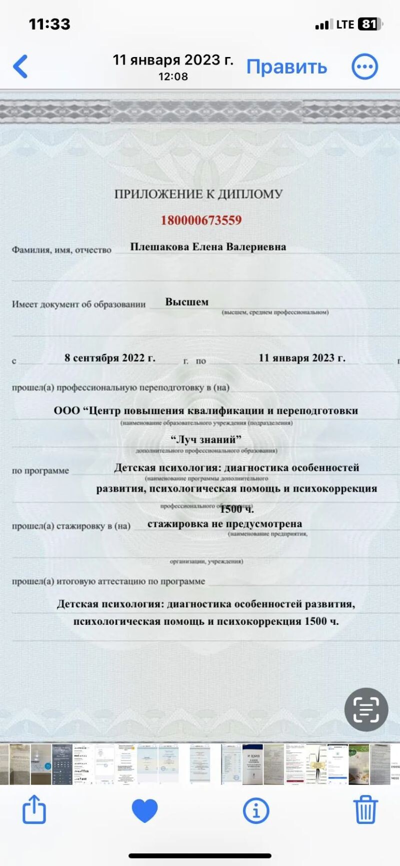 - ООО «Центр повышения квалификации и переподготовки», программа «Детская психология: диагностика особенностей развития, психологическая помощь, психокоррекция», 2022–2023 гг.