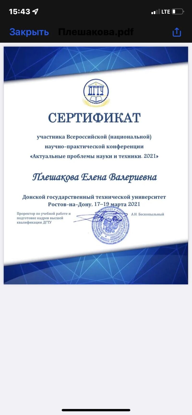 - Всероссийская (национальная) научно-практическая конференция «Актуальные проблемы науки и техники, 2021», участник.