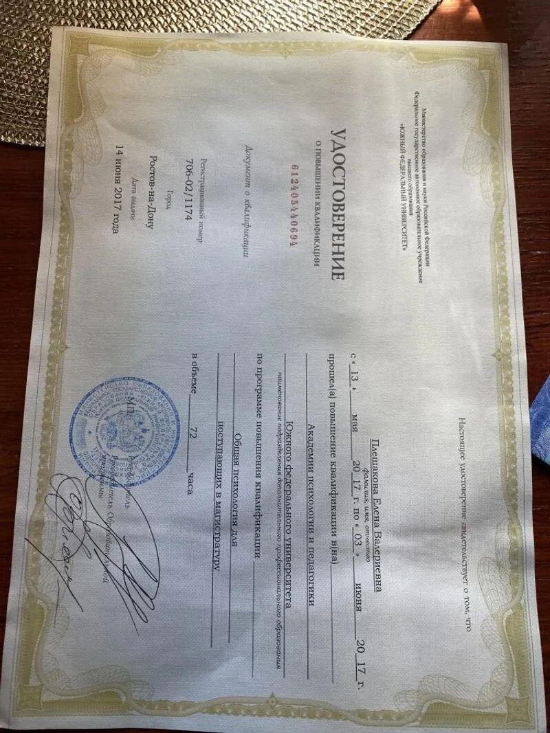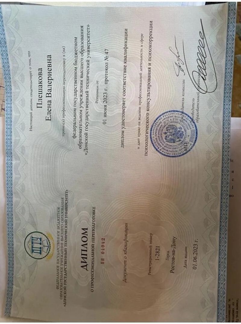 - Донской государственный технический университет, программа «Психологическое консультирование и психокоррекция», 2023 г.