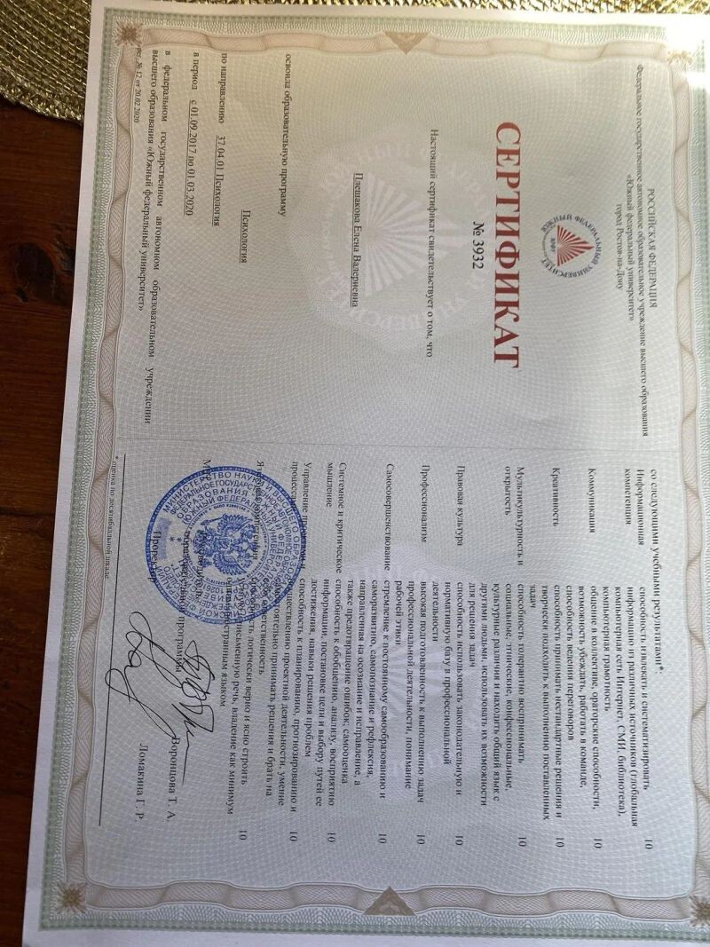- Южный федеральный университет, образовательная программа «Психология», 2017–2020 гг.