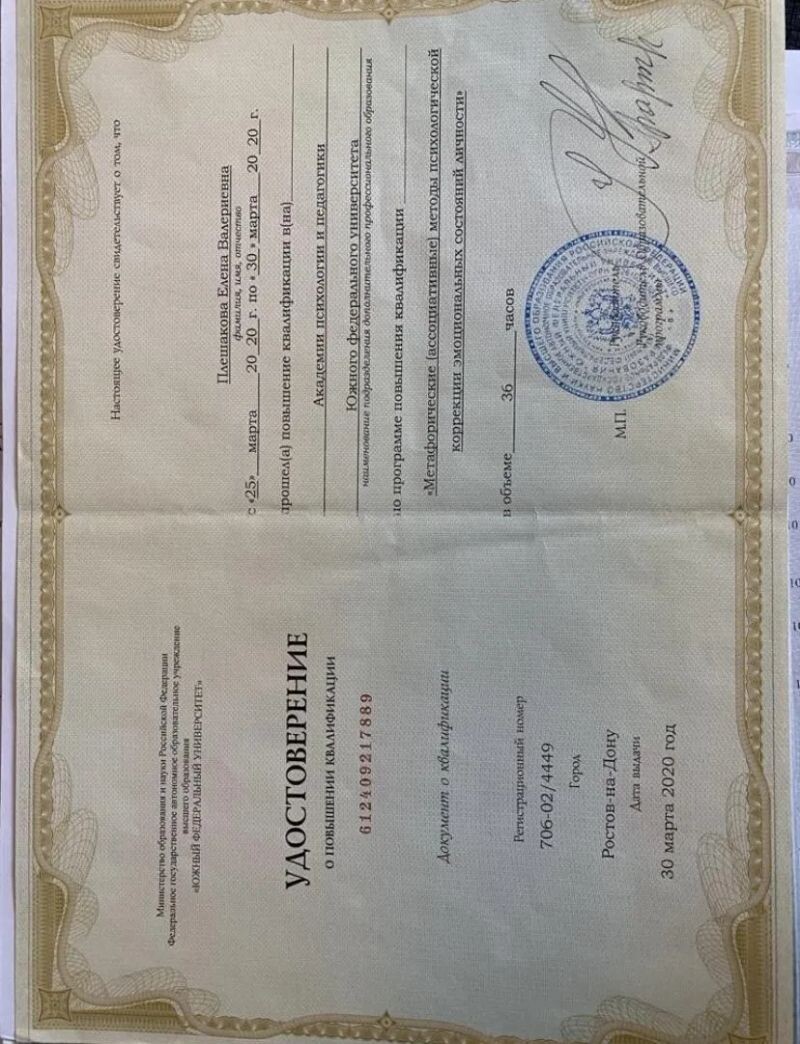 - Академия психологии и педагогике, программа «Метафорические (ассоциативные) методы психологической коррекции эмоциональных состояний личности», 2020 г.