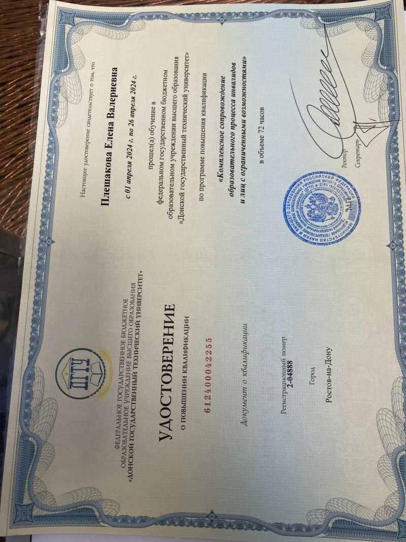 - Донской государственный технический университет, программа «Комплексное сопровождение образовательного процесса инвалидов и лиц с ограниченными возможностями», 2024 г.