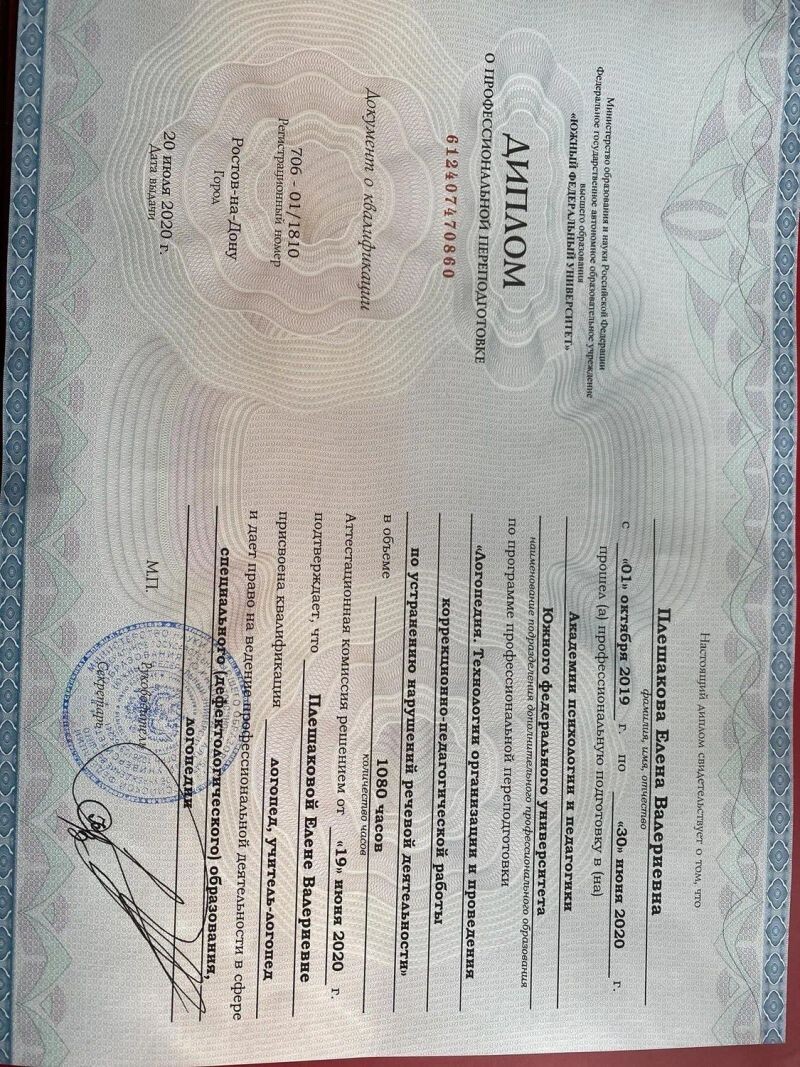 - ЮФУ, логопед-педагог, 2019–2020 гг.