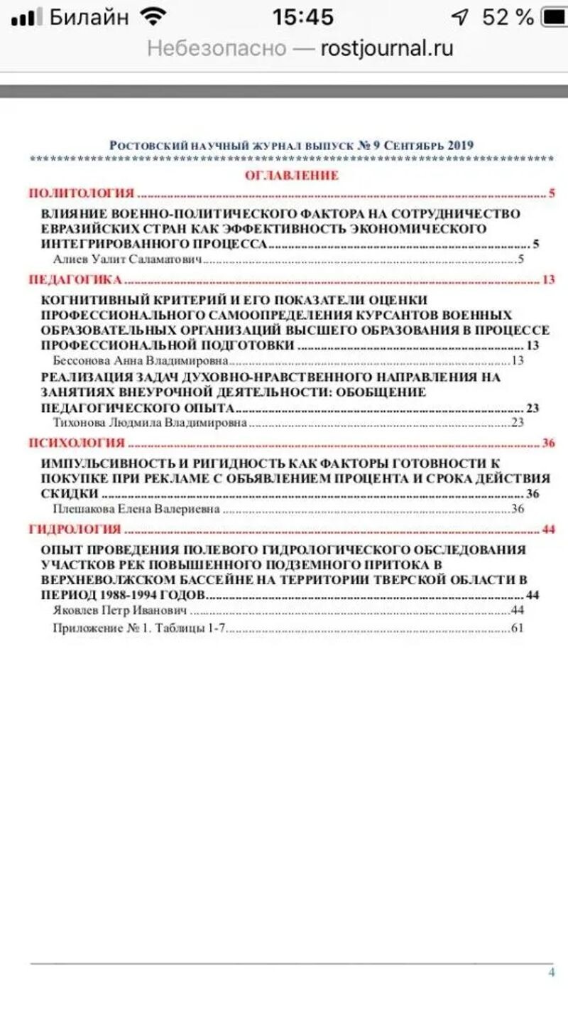 - Статья в журнале «Ростовский научный журнал» (с 2019 г.).