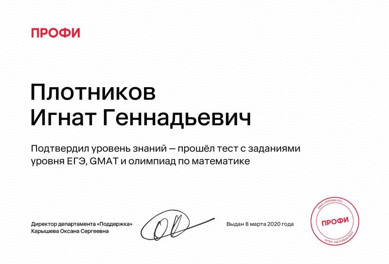 - Подтвердил уровень знаний — Прошёл тест с заданиями уровня ЕГЭ, GMAT и олимпиад по математике (с 2020 г.).