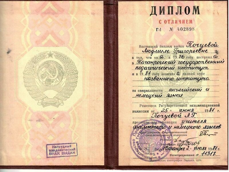 - Таганрогский государственный педагогический институт, факультет иностранных языков, специальность – учитель английского и немецкого языков, 1976–1981 гг.