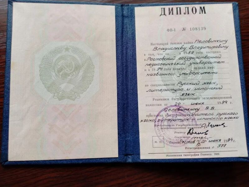 - Ростовский государственный педагогический университет, русский язык, литература и испанский язык, 1989–1994 гг.