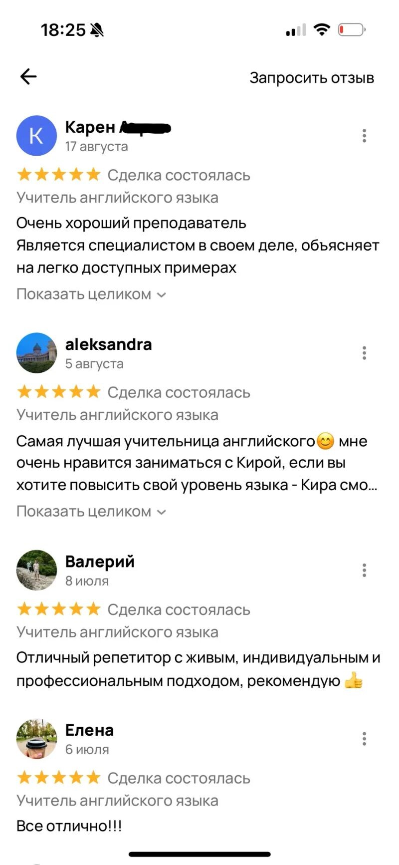 Кира Александровна очень располагает к себе.С первого занятия приняла решение,что буду заниматься дальше.После плохого опыта с другим репетитором,были некоторые сомнения,которые Кира развеяла.Очень нравятся уроки,даже не замечаю,как пролетает целый час.Для меня составили индивидуальную программу,за счёт которой у меня действительно пополнился словарный запас,а также поднялся уровень знаний🤍