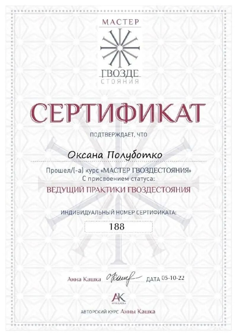 - Авторский курс Анны Кашка, ведущий практики гвоздестояния, 2022 г.