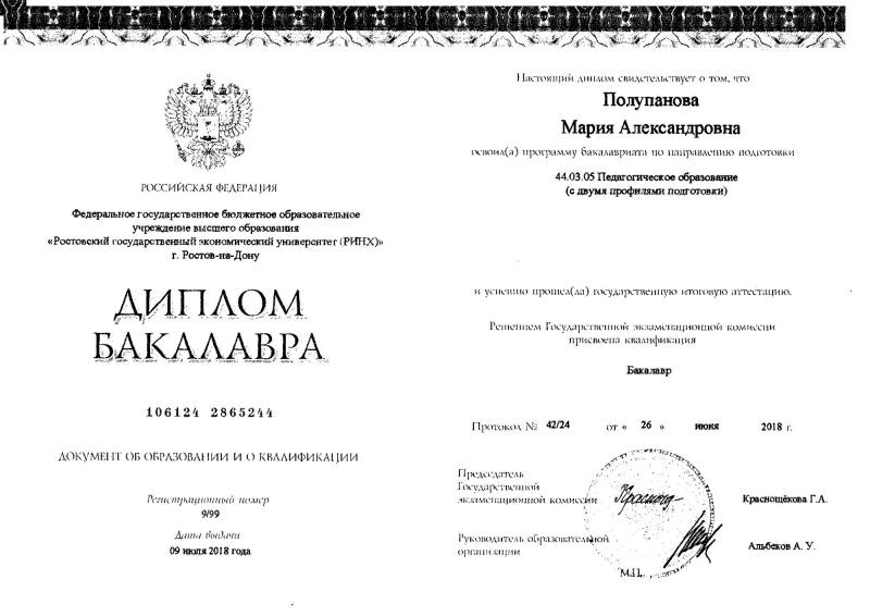 - ТИ им. А.П. Чехова филиал ФГБОУ ВО РГЭУ (РИНХ), факультет иностранных языков, специализация – преподаватель иностранных языков (английский), 2013–2018 гг.