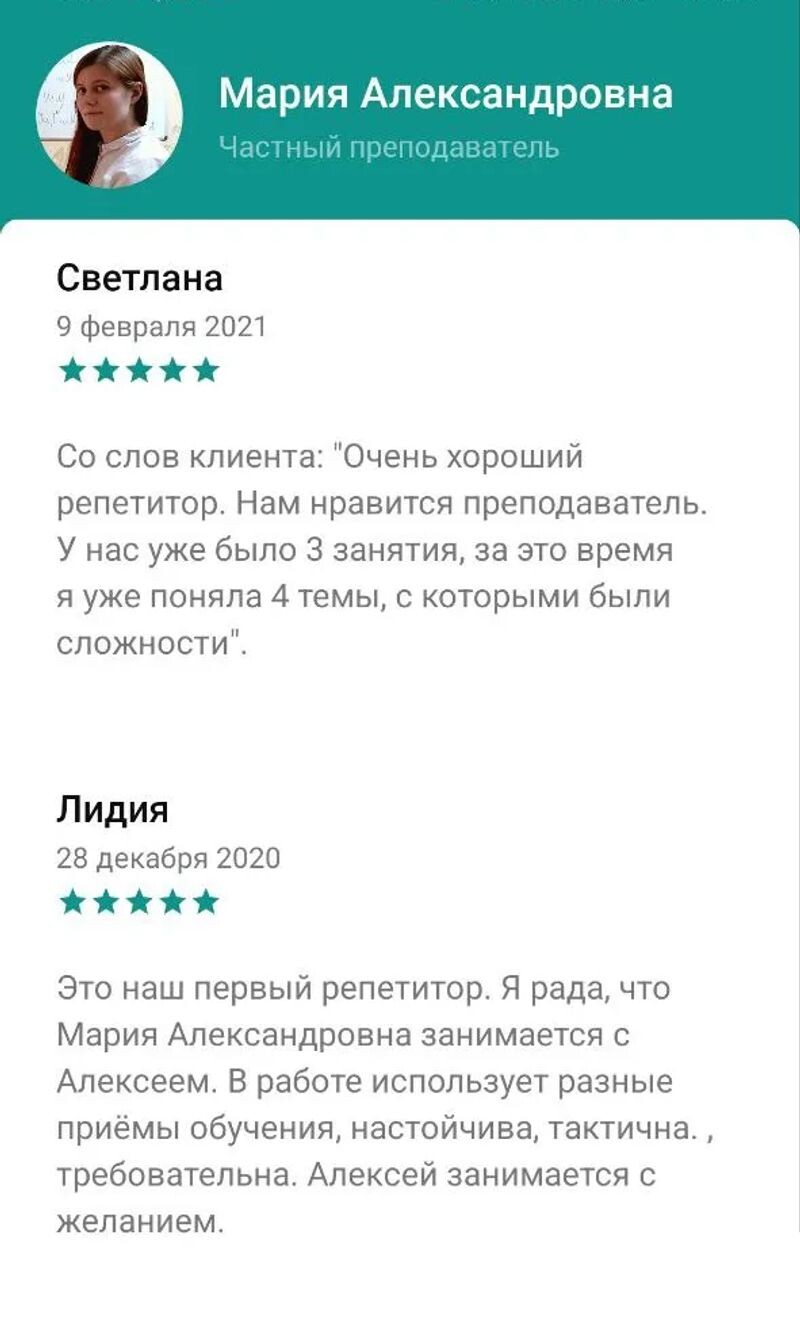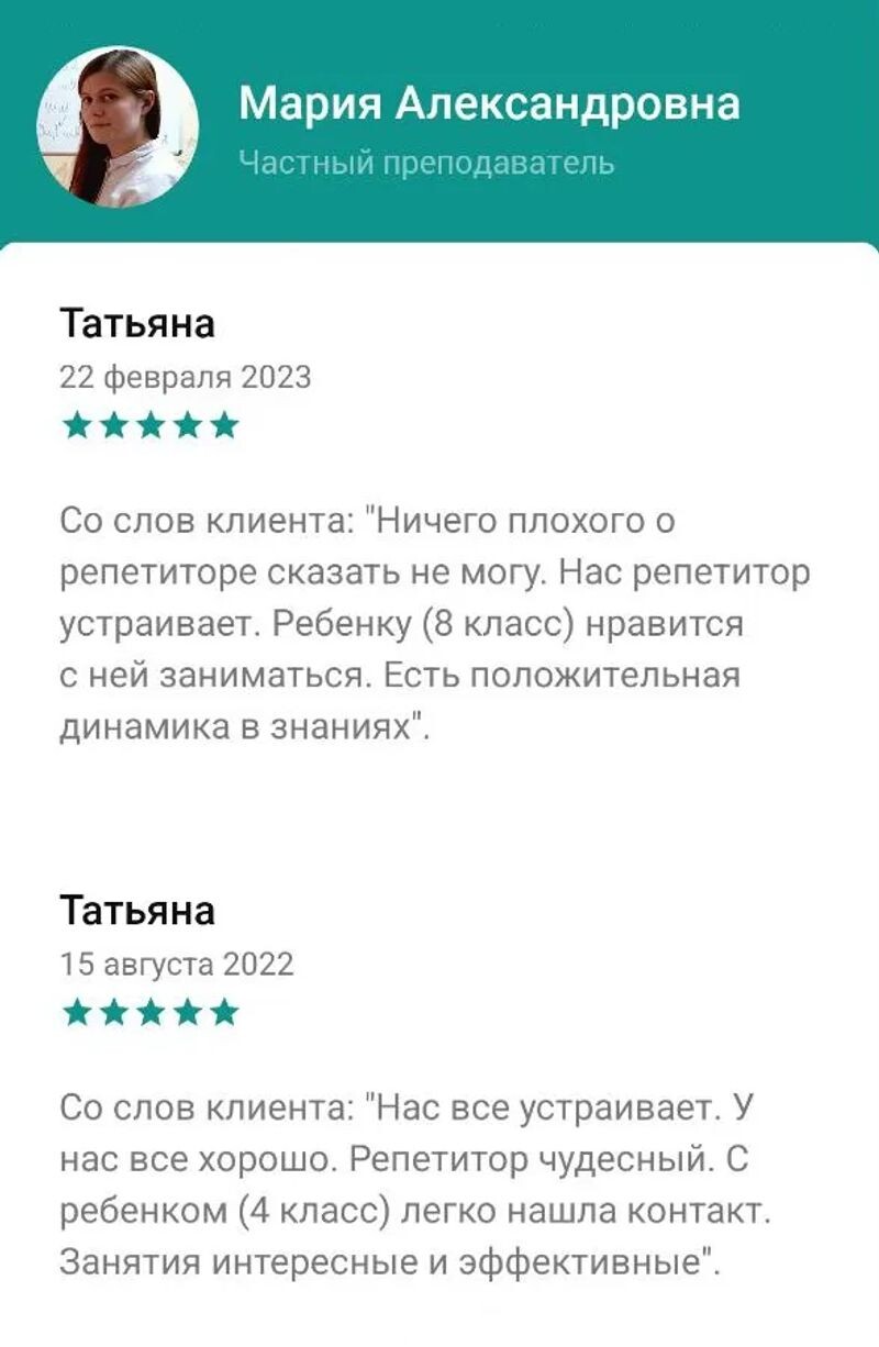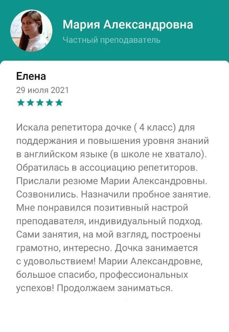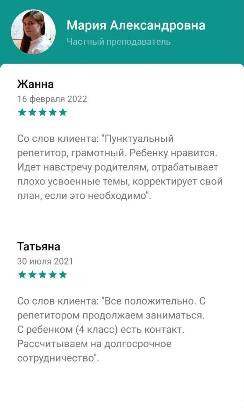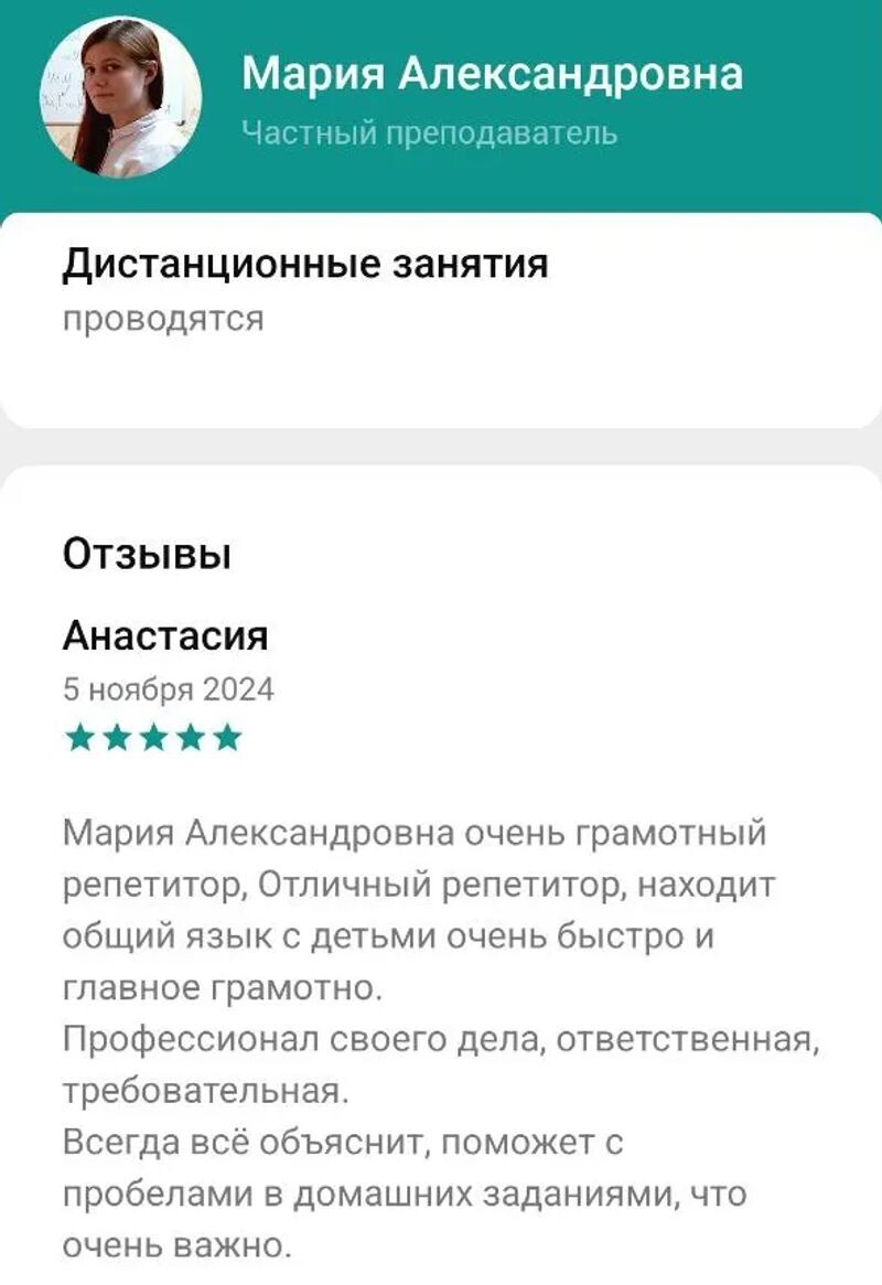 Мария Александровна пунктуальна, дочке понравилось первое занятие. Будем заниматься дальше! Говорит, что Мария Александровна хорошо объясняет, и если что-то непонятно, она всегда может переспросить. Для нас это очень важно. Рекомендуем Марию Александровну.