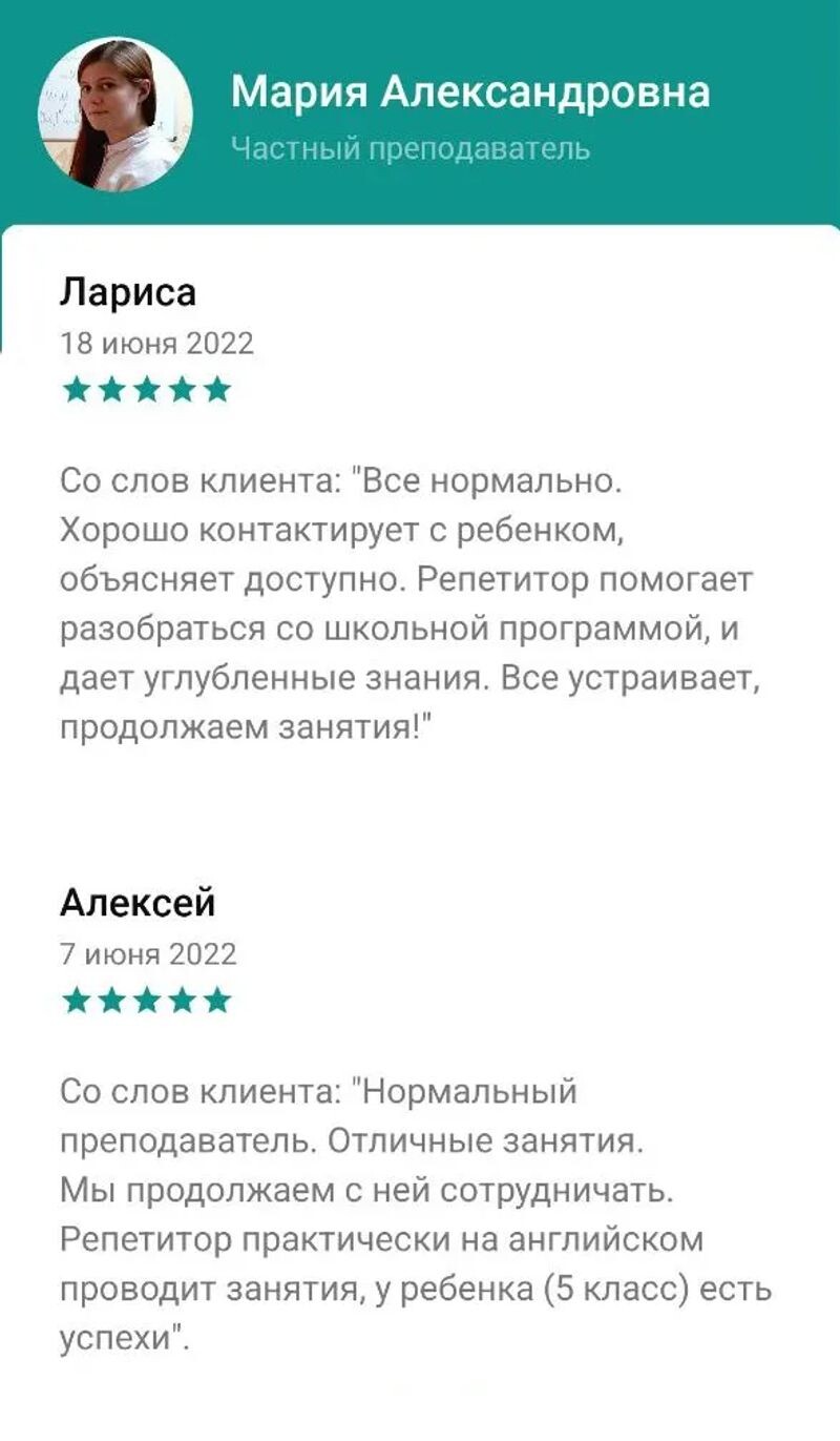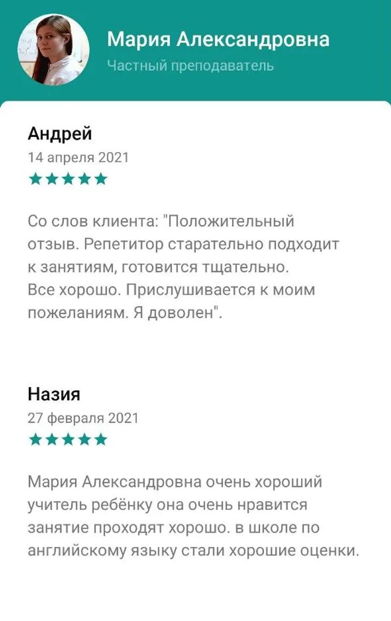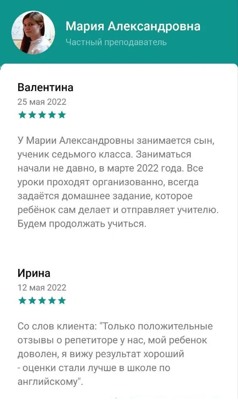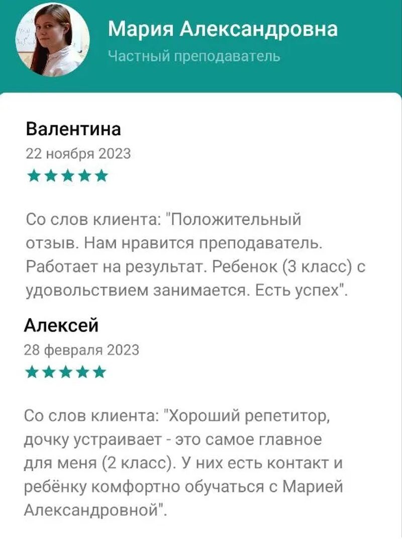 Мария Александровна пунктуальна, дочке понравилось первое занятие. Будем заниматься дальше! Говорит, что Мария Александровна хорошо объясняет, и если что-то непонятно, она всегда может переспросить. Для нас это очень важно. Рекомендуем Марию Александровну.