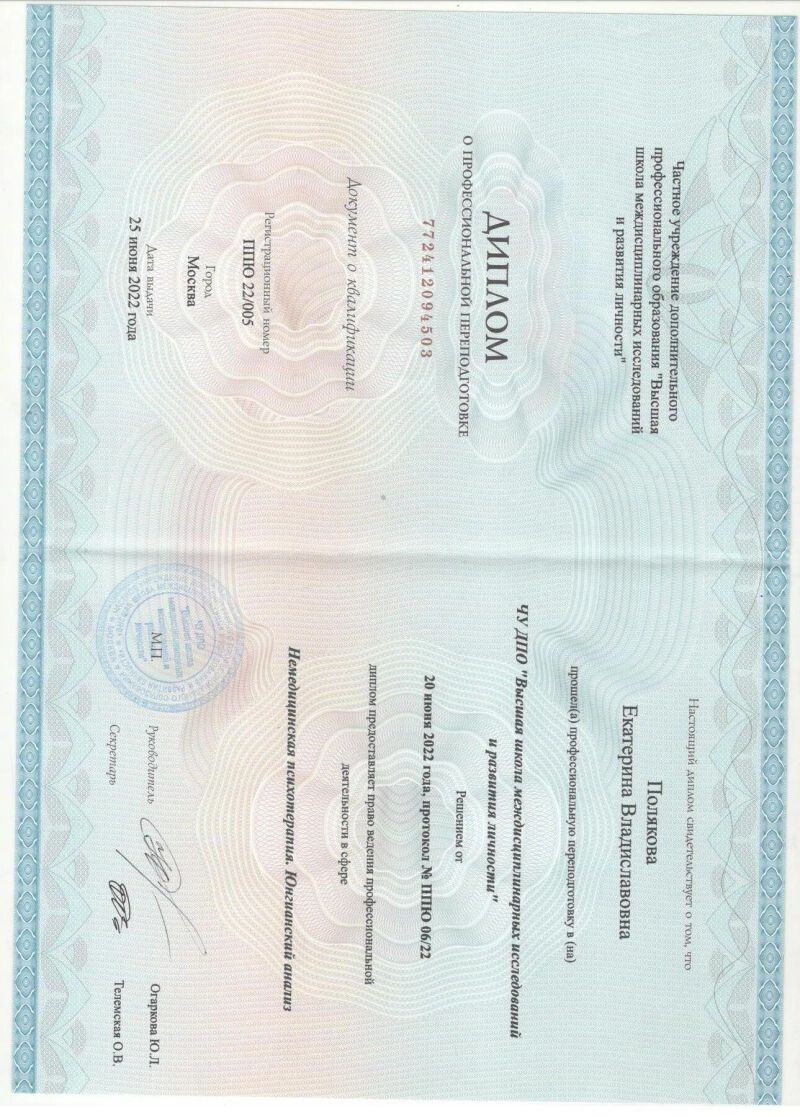 - Высшая школа междисциплинарных исследований и развития личности, программа «Немедицинская психотерапия. Юнгианский анализ», 2020–2022 гг.