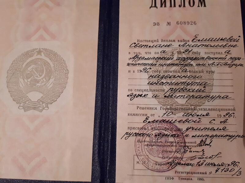 - Окончила Арзамасский государственный педагогический институт им. А.П. Гайдара (г. Арзамас, Нижегородская обл.), факультет русского языка и литературы, квалификация – учитель русского языка и литературы, 1996 г.