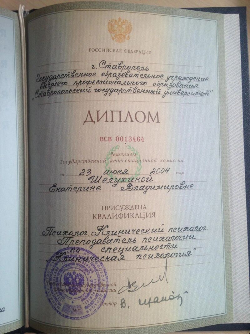 - Ставропольский государственный университет, квалификация «психолог, клинический психолог, преподаватель психологии» специальность «клиническая психология», 1999–2004 гг.