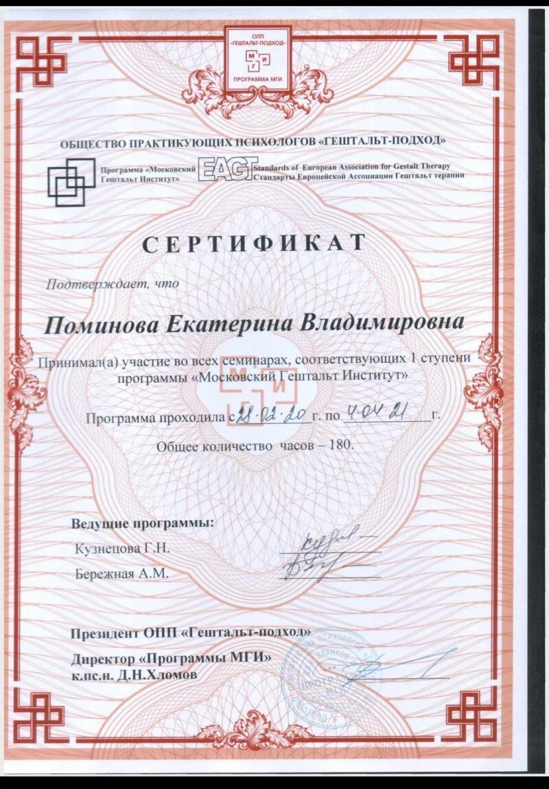 - МГИ, программа «Гештальт-подход, 1 ступень», 2020–2021 гг.
