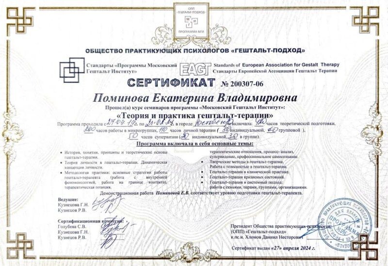 - МГИ, программа «Теория и практика гештальт-терапии», 2019–2024 гг.