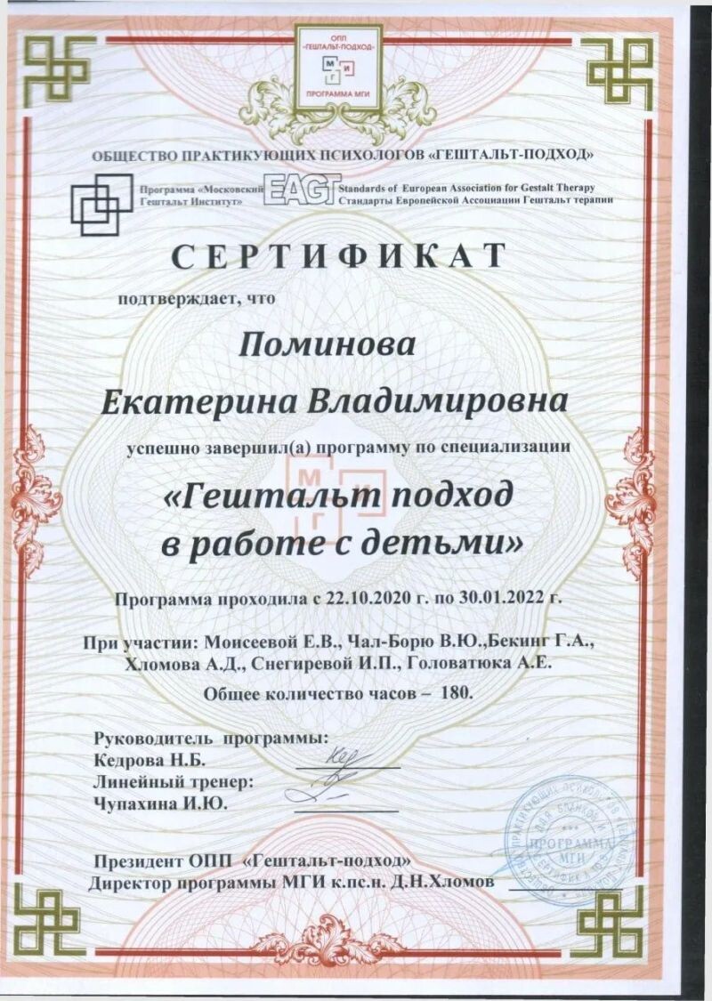 - МГИ, программа «Гештальт-подход в работе с детьми», 2020–2022 гг.