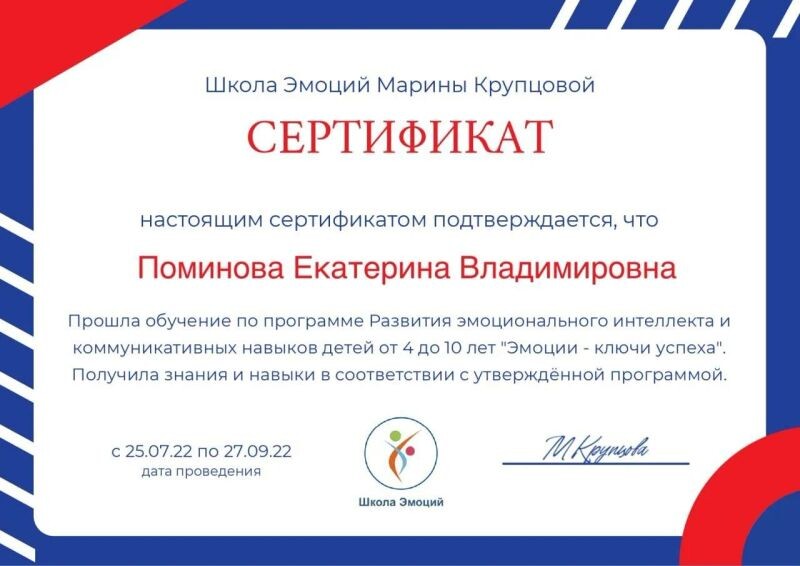 - Школа эмоций Марины Крупцовой, программа «Развитие эмоционального интеллекта и коммуникативных навыков у детей от 4 до 10 лет», 2022 г.