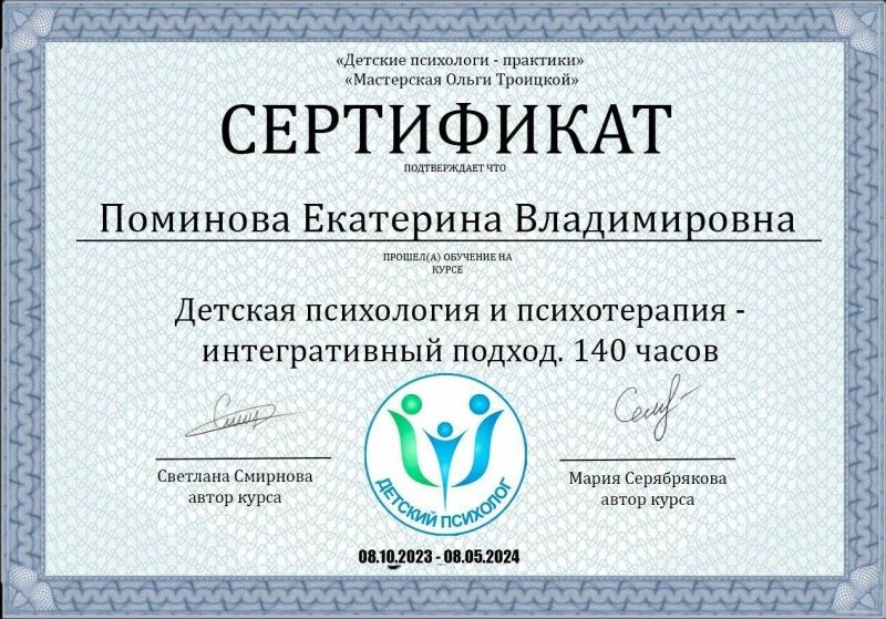 - Мастерская Ольги Троицкой, обучающий курс «Детская психология и психотерапия-интегративный подход», 2023–2024 гг.