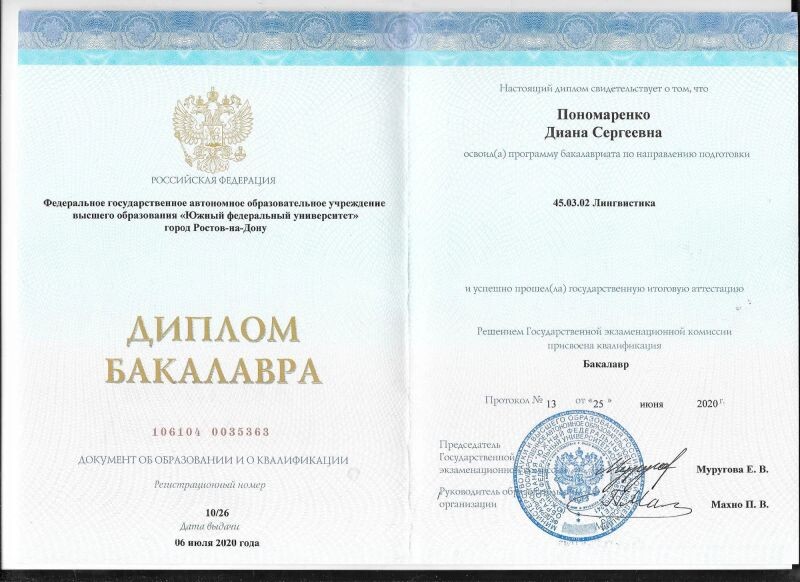 - ФГАОУ ВО «Южный федеральный университет», лингвистика, 2014–2020 гг.