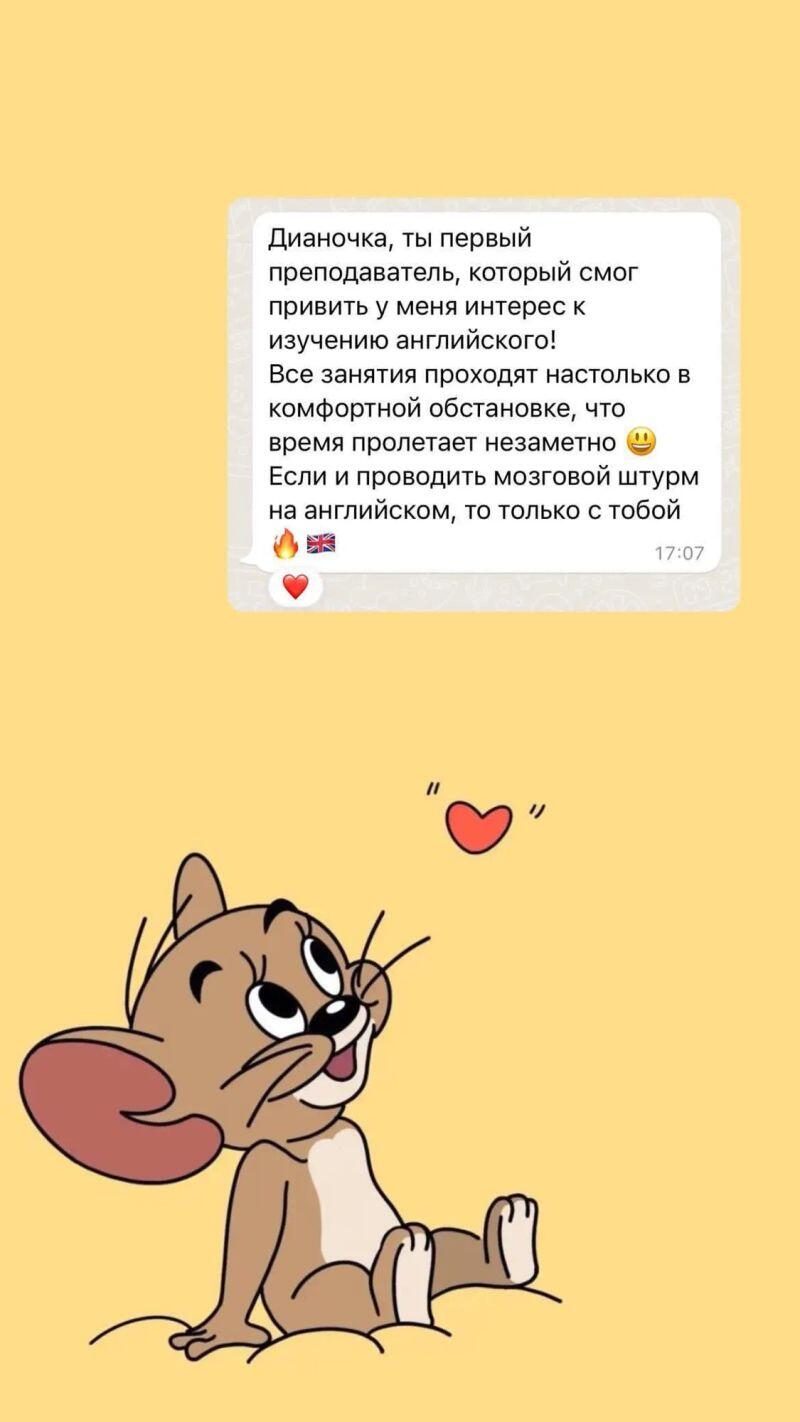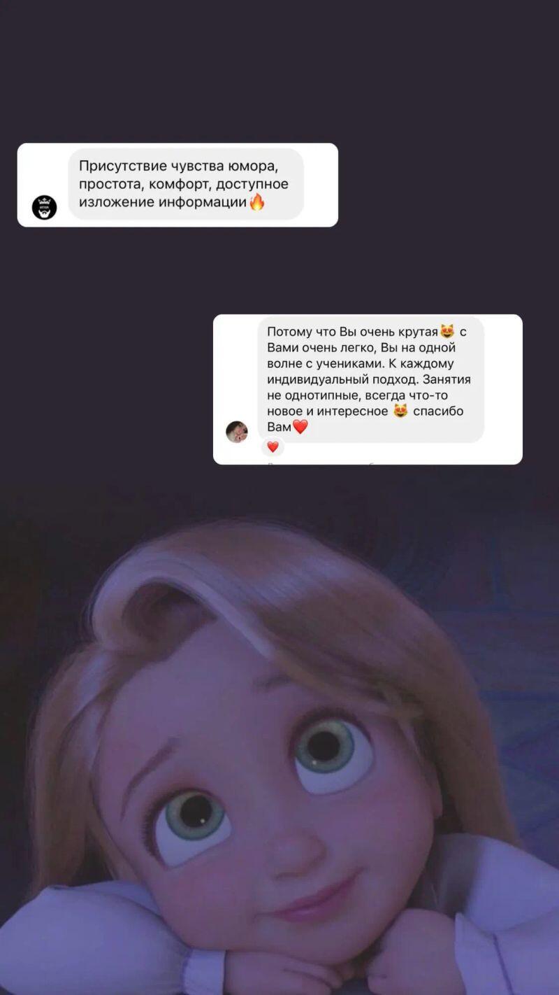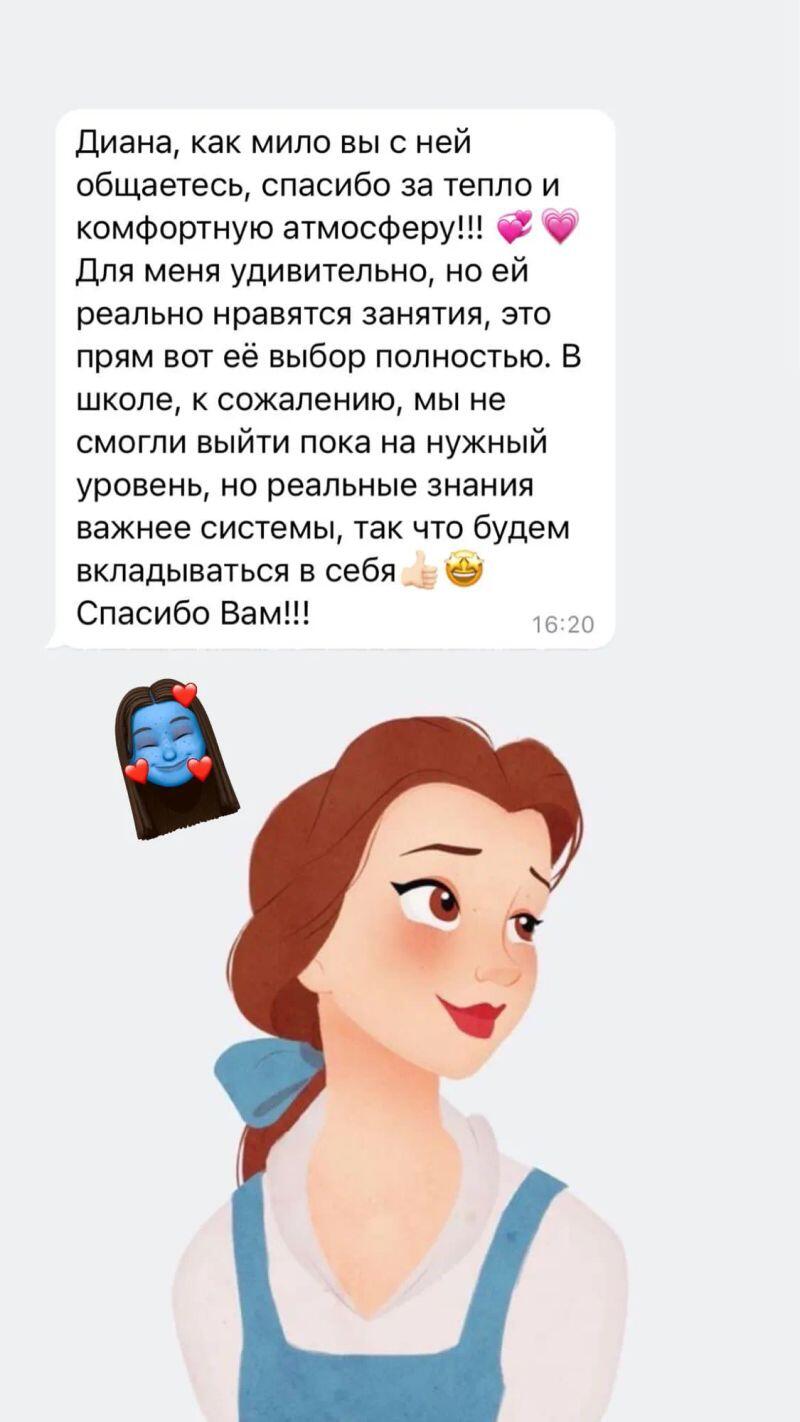 Впервые изучать Английский язык, это не тяжкий труд, а сплошное удовольствие) очень легко найти общий язык с Дианой, можно свободно разговаривать на любые темы и смущение от того, что говоришь коряво и с ошибками быстро уходит) сама форма урока классно построена, что меня больше всего поразило: одна тема урока была посвящена Хэллоуину, и там были классные вопросы: чего ты больше боишься давать деньги в долг или брать деньги? Ты больше боишься снимать в аренду квартиру или платить ипотеку?) на мой взгляд, очень креативно) тема страха интересно была раскрыта, заставляет задуматься) в общем, впервые я быстро не слилась с изучения языка и это в большей мере заслуга преподавателя) очень рекомендую)
