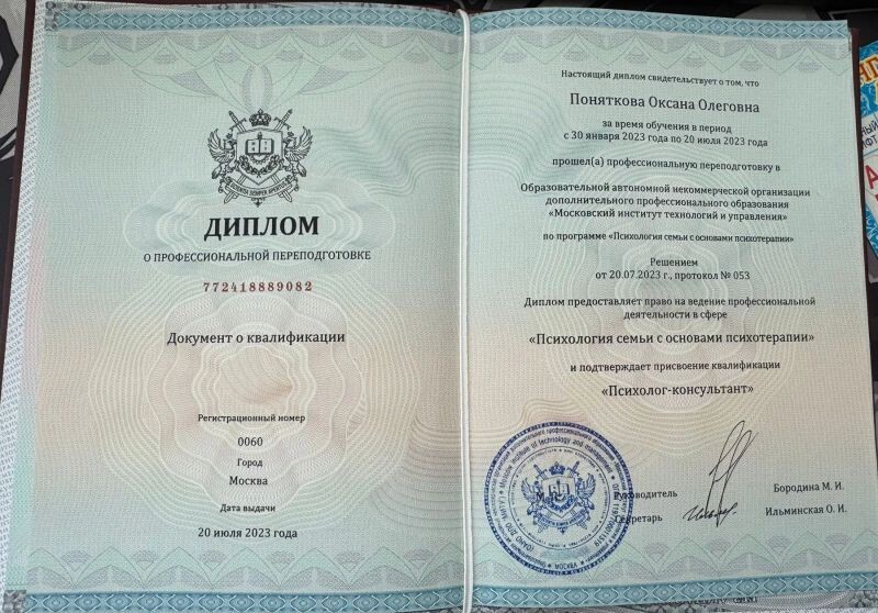 - Московский институт технологий и управления, программа «Психология семьи с основами психотерапии», квалификация «психолог-консультант», 2023 г.