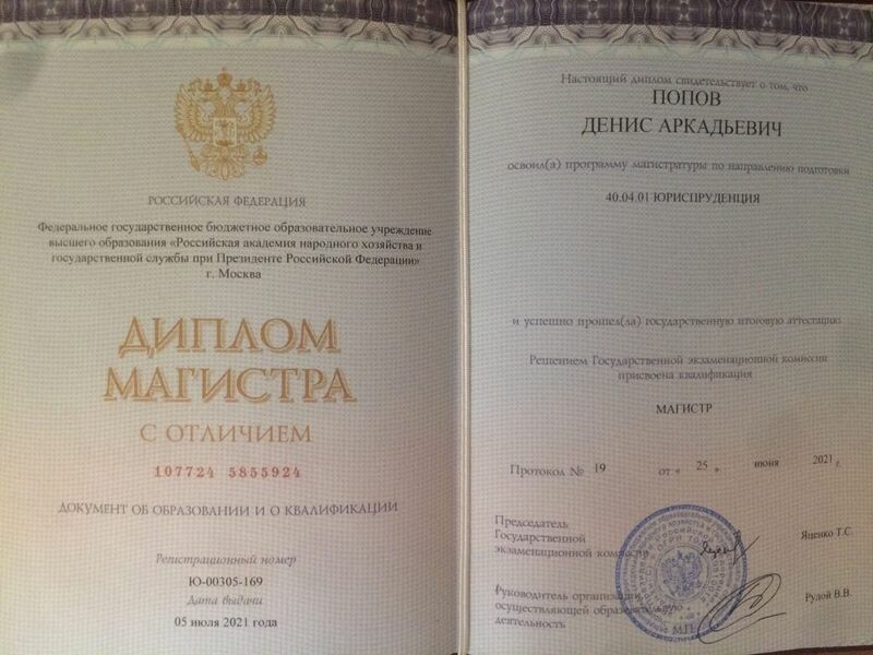 - Российская академия народного хозяйства и государственной службы при Президенте РФ, юридический факультет, специализация — гражданское право, семейное право, международное частное право, 2019–2021 гг.