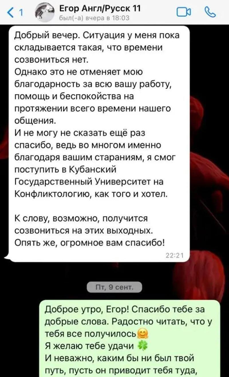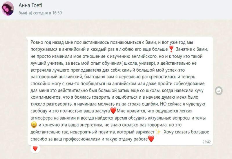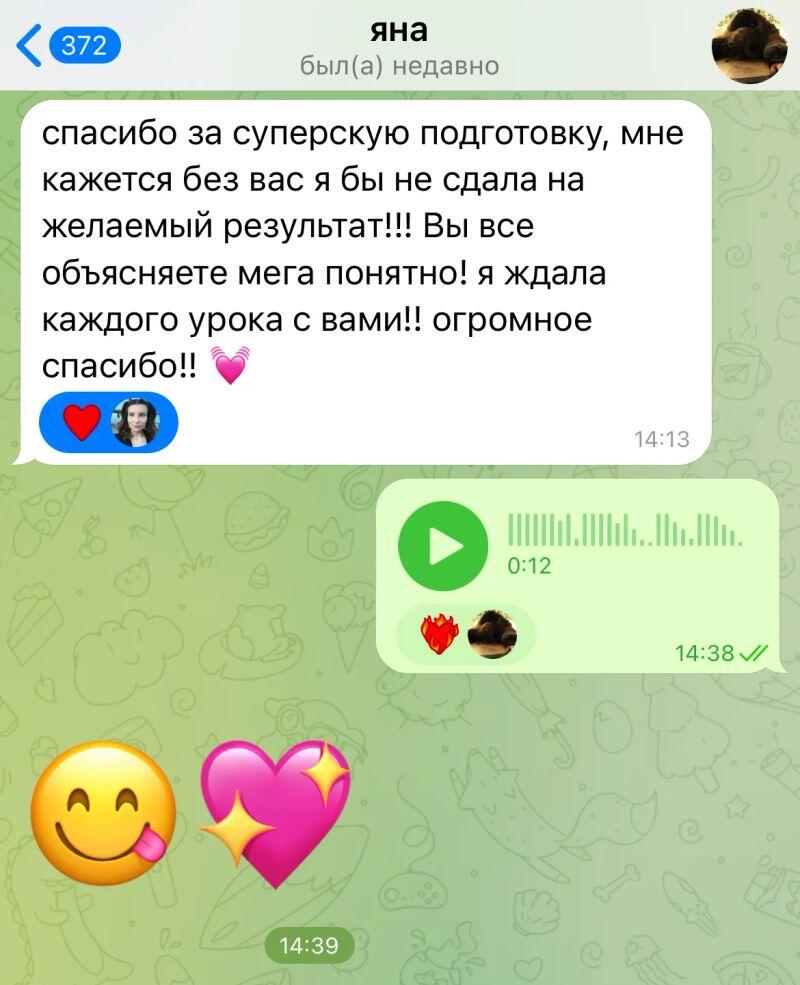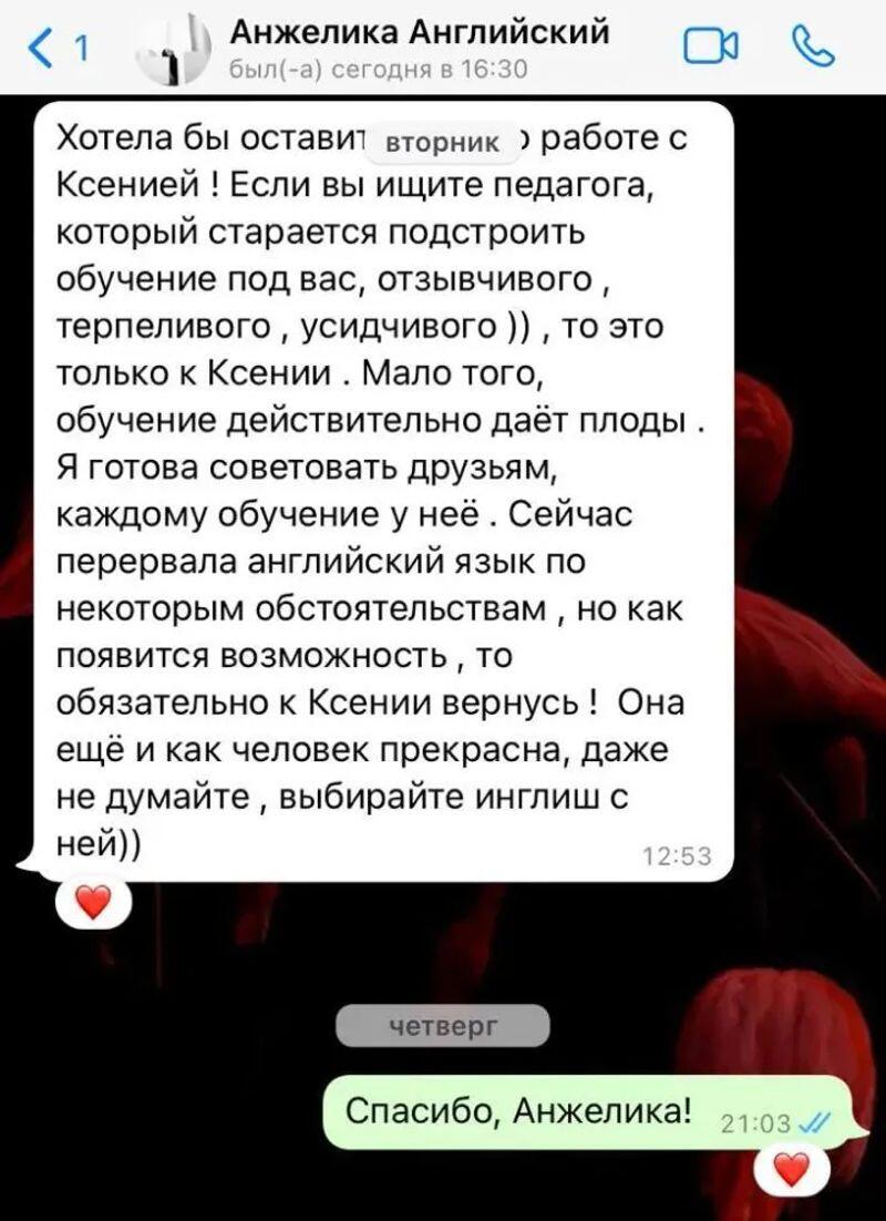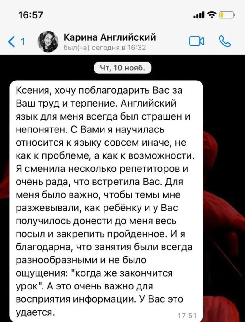 Хочу выразить благодарность Ксении Алексеевне за замечательную атмосферу на занятиях! Всегда ощущается легкость и отсутствие давления от преподавателя. Материал объясняется просто и с использованием примеров, что улучшает понимание информации. Уже вижу прогресс в своей подготовке к toefl, благодаря четкому плану преподавателя. Также хочу отметить отзывчивость Ксении Алексеевны и ее поддержку вне занятий. Она помогает мотивироваться и следит за прогрессом. Рекомендую этого прекрасного преподавателя, который находит индивидуальный подход и стремится улучшить слабые стороны ученика!