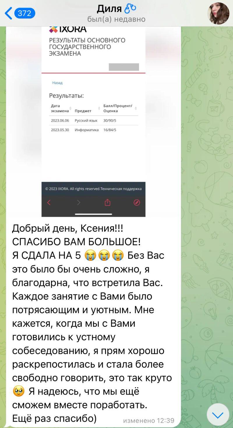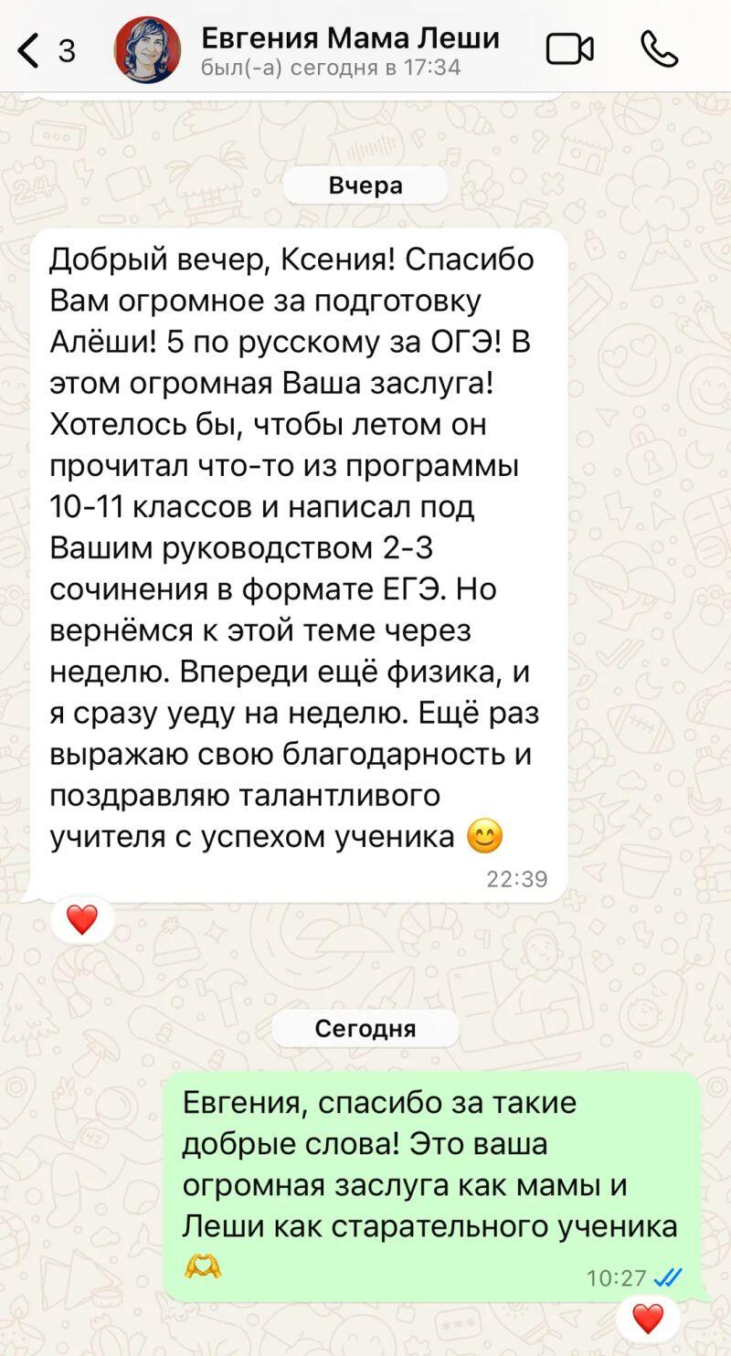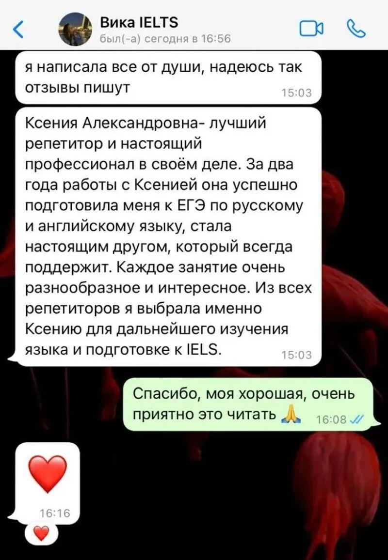 Я получила огромное количество полезной информации на каждом занятии с Ксенией Алексеевной. Она не просто дала правила, а помогла мне разобраться в них и понять интуитивно. Моя подготовка к ЕГЭ прошла на высшем уровне благодаря ее помощи. Я с нетерпением ждала каждого урока и полюбила русский язык еще больше благодаря ее урокам.