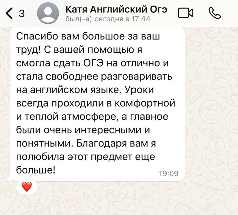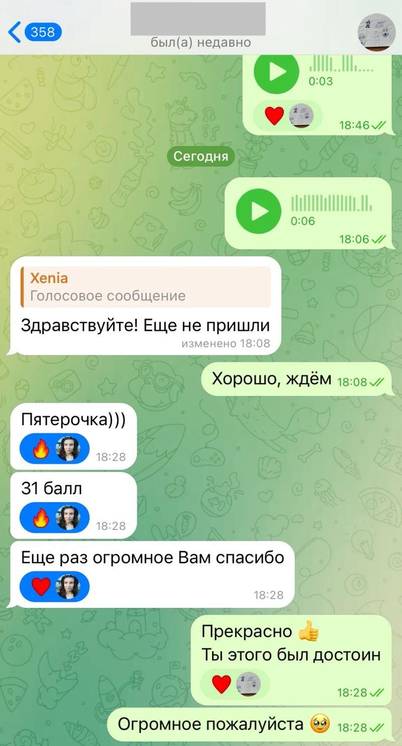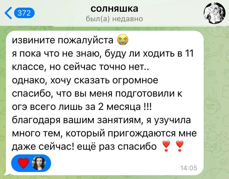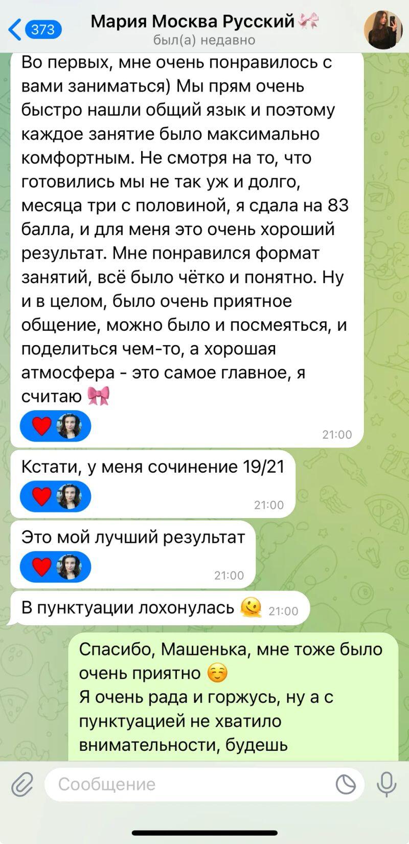 Я получила огромное количество полезной информации на каждом занятии с Ксенией Алексеевной. Она не просто дала правила, а помогла мне разобраться в них и понять интуитивно. Моя подготовка к ЕГЭ прошла на высшем уровне благодаря ее помощи. Я с нетерпением ждала каждого урока и полюбила русский язык еще больше благодаря ее урокам.