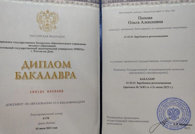 - Ростовский государственный экономический университет (РГЭУ (РИНХ)), Лингвистика и журналистика, Зарубежное регионоведение (Восточная Азия), 2019–2023 гг.