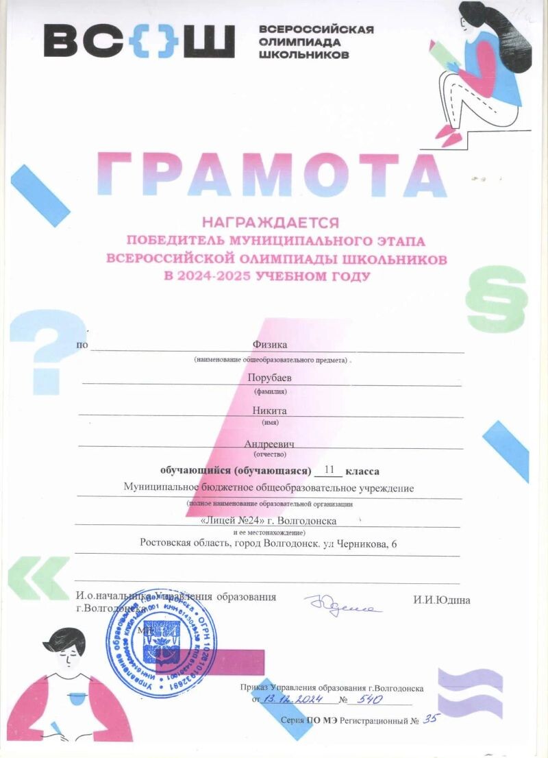 - Победитель Муниципального этапа ВСОШ по физике (с 2024 г.).