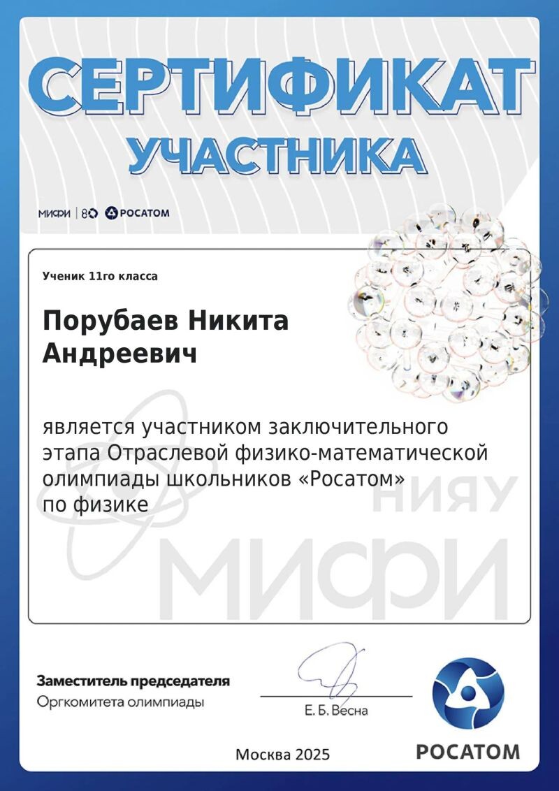 - Участник заключительного этапа олимпиады "Росатом" 11 класс (с 2025 г.).