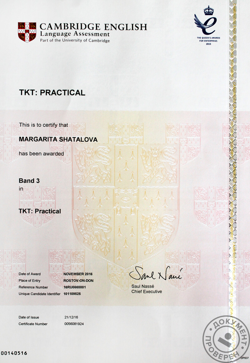 - Кембриджский сертификат TKT practical (декабрь 2016 г.).
